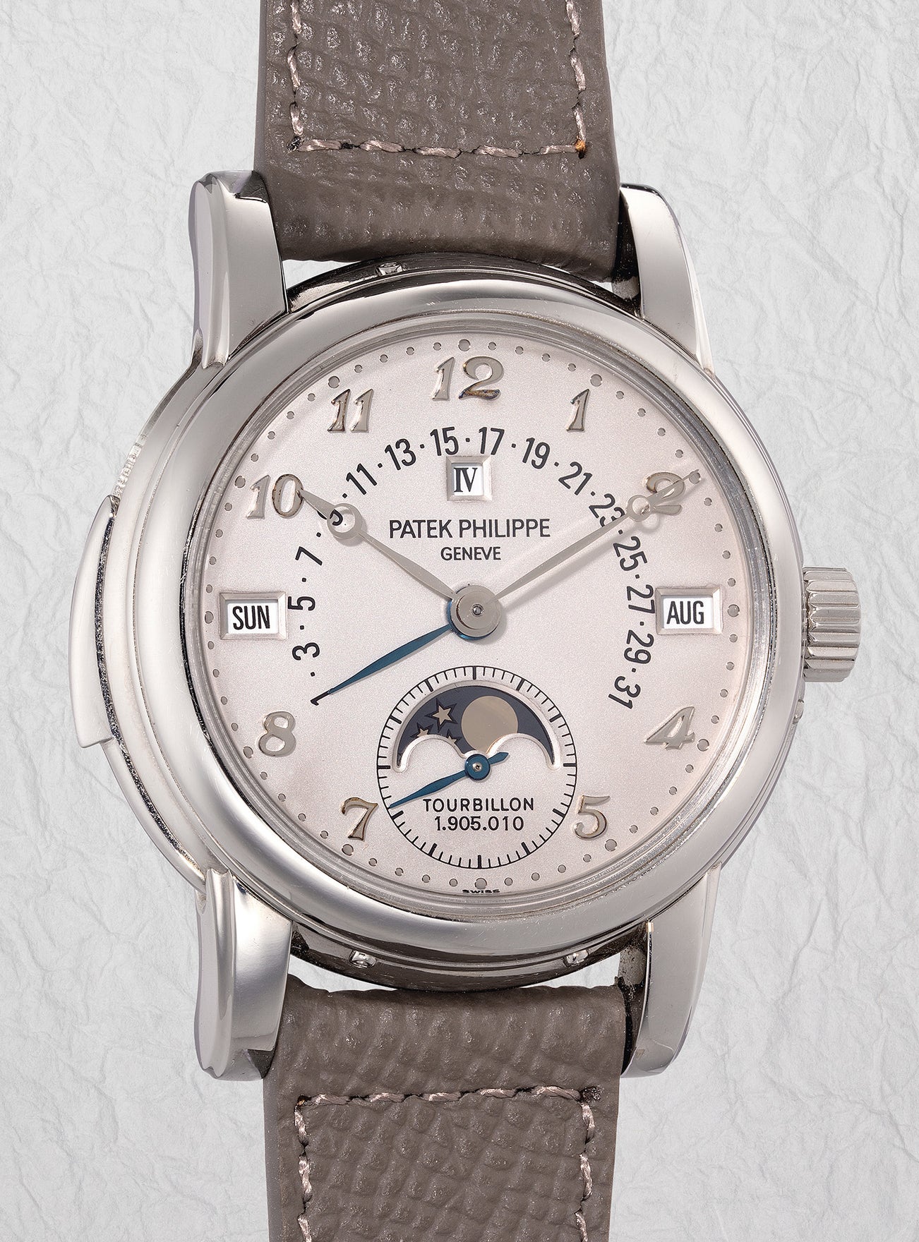 An exceedingly rare, important and special platinum minute repeating perpetual calendar tourbillon wristwatch with retrograde date, small seconds, moon phases, leap year indication, silvered Breguet numerals dial, Certificate of Origin, presentation box and additional grey dial with Roman numerals