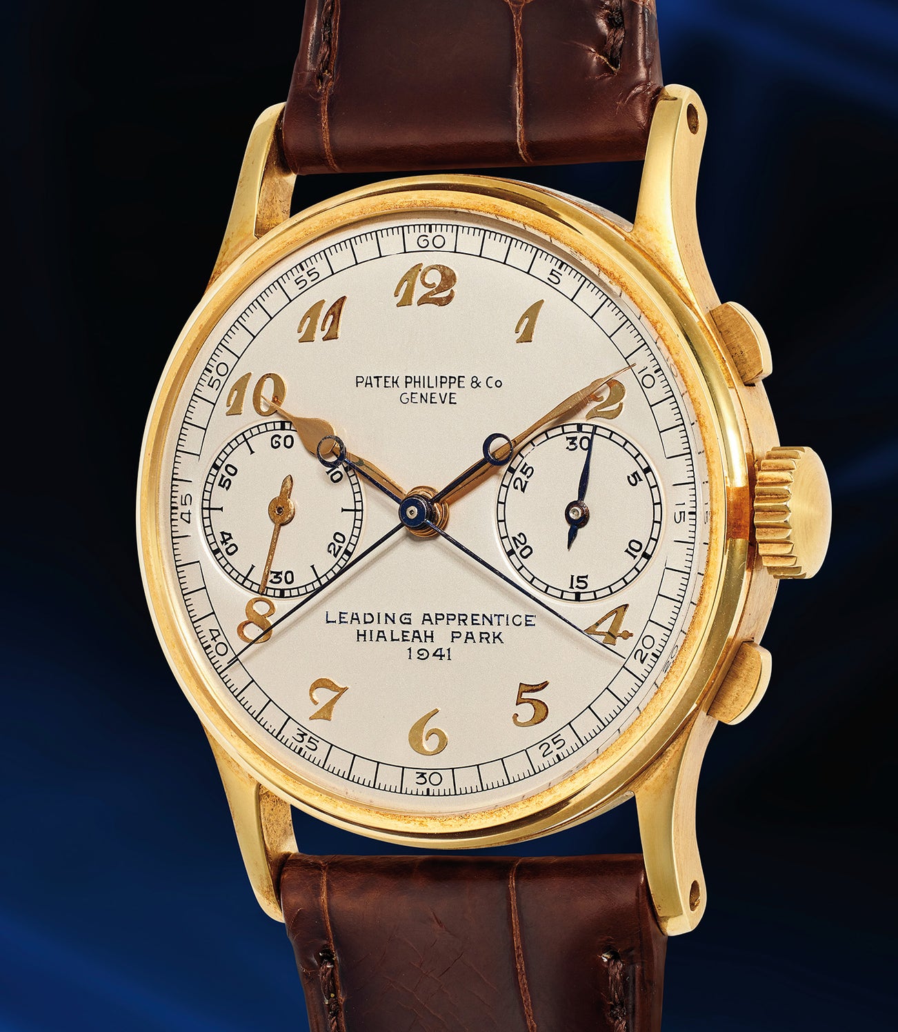 The present split-seconds chronograph is most probably unique, and one of the most important Patek Philippe timepieces with horse racing history to come to market. One of only about 25 known examples to be encased in yellow gold, this reference 1436 is among very few with Breguet numerals, as confirmed by the Extract from the Archives. What makes this watch even more extraordinary is the special inscription found at 6 o’clock: 'Leading Apprentice Hialeah Park 1941.' The raised, hard enamel inscription indicates that the dial was specially commissioned by Patek Philippe before production, to be gifted to a most exceptional horse racer. Everything about the dial is extraordinary and indicative of a special order – the enamel Breguet numerals, the lack of an outer scale on the dial for both maximum legibility and additional room for the full inscription at 6 o’clock, and finally, larger sub-dials than typically seen on the reference.