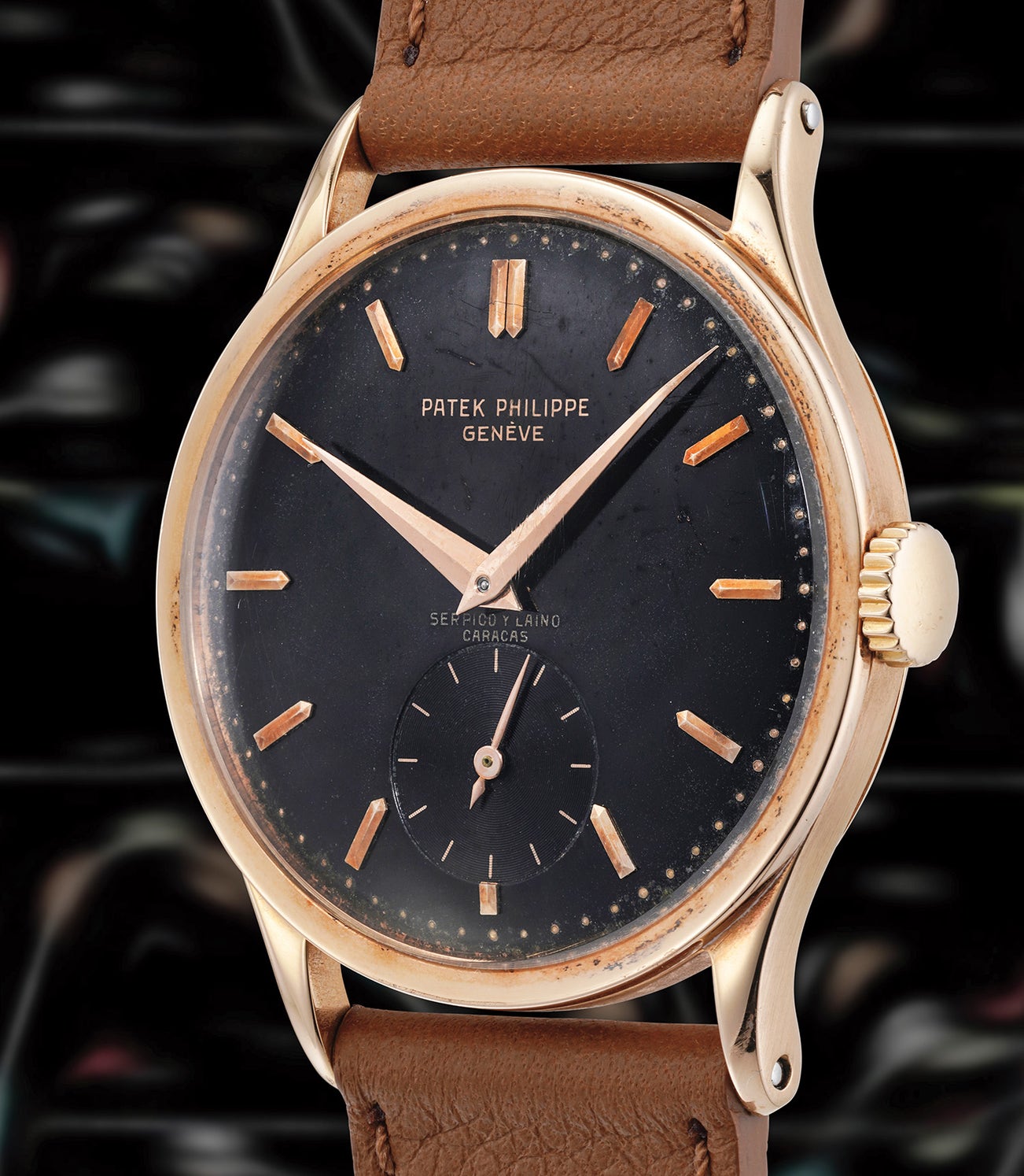 The present reference 570’s visually stimulating design cannot be underlined enough. The beautifully well preserved pink gold case perfectly frames the black glossy dial, bold baton indexes and large seconds subcounter providing a timeless and incredibly contemporary look. However, the four words discretely printed above the subseconds counter make this watch truly unique. The Serpico y Laino Carracas signature, also repeated on the caseback, can be found occasionally on the dials of Patek Philippe timepieces, a rare privilege granted by the Geneva brand to its most prominent retailers.