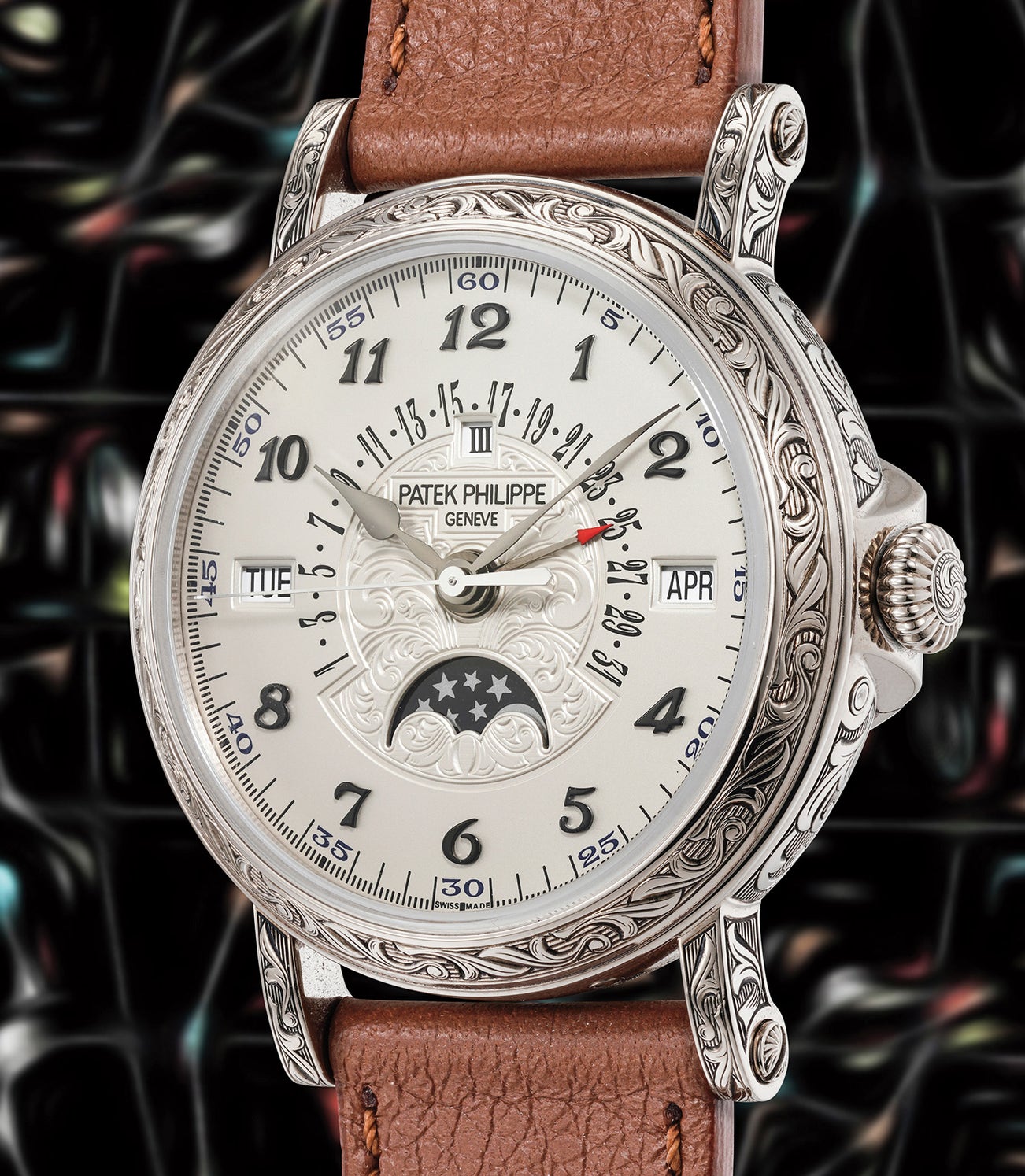 Retaining the "Officier" style case of the previous model, reminiscent of early 20th-century watches with hinged caseback and screw-down bars, the ref. 5160 elevates the design by exquisitely hand-engraving arabesque motifs reminiscent of the Belle Époque not only to the virtual entirety of the case - an incredible detail is the engraved screw-heads of the lugs - but also to the dial and clasp.