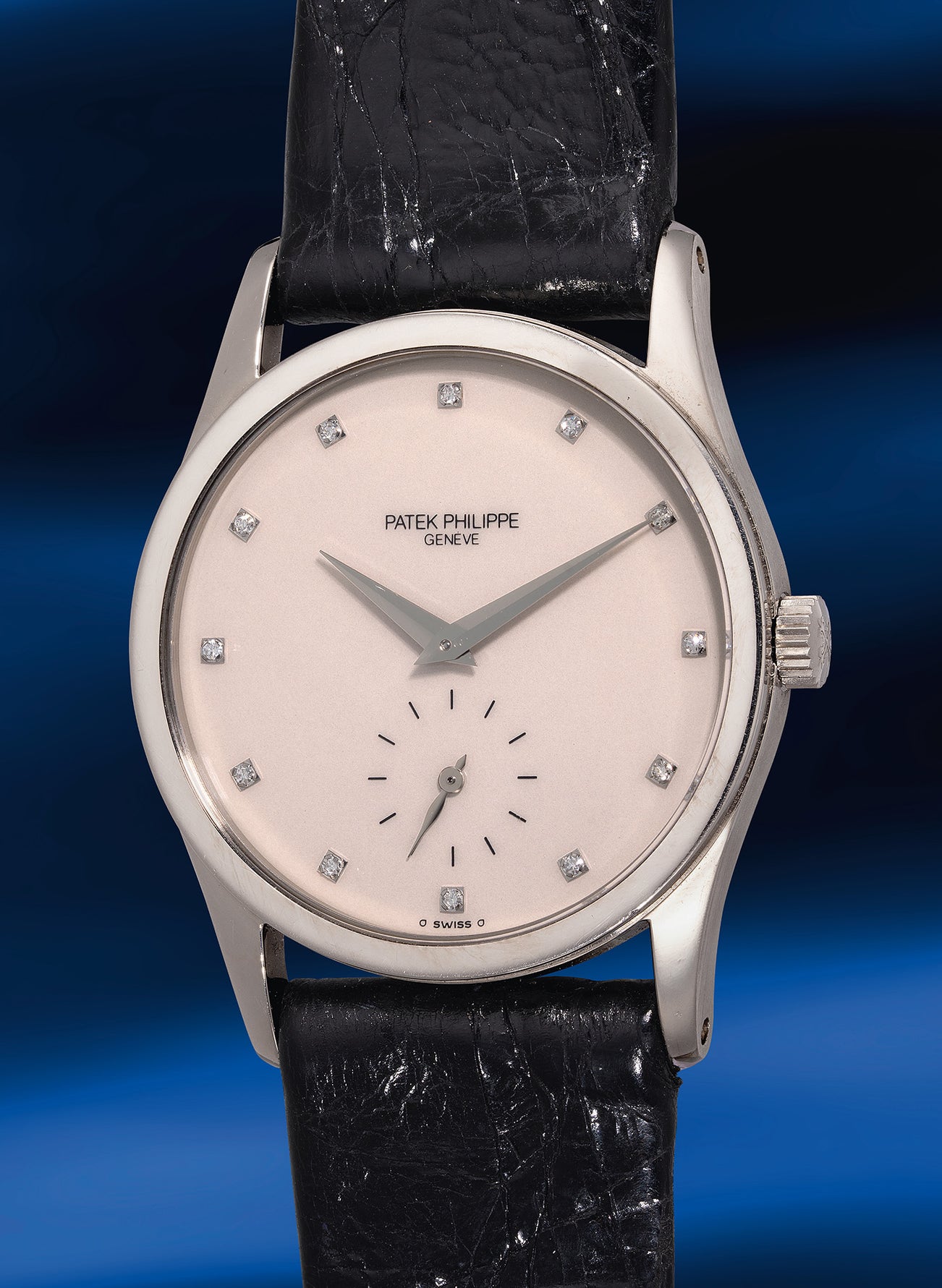 The reference 3796 comes in various case metals, with the present white gold specimen being the rarest of the four materials produced. Showcasing a captivating dial configuration characterized by diamond-set hour markers against a white ivory dial, the design is complemented by simple black markers at the small seconds and a feuille hand. Notably, the lower-case Greek letter sigma beside the "Swiss" signature at the bottom of the dial indicates that the hands and hour markers are crafted from solid gold.