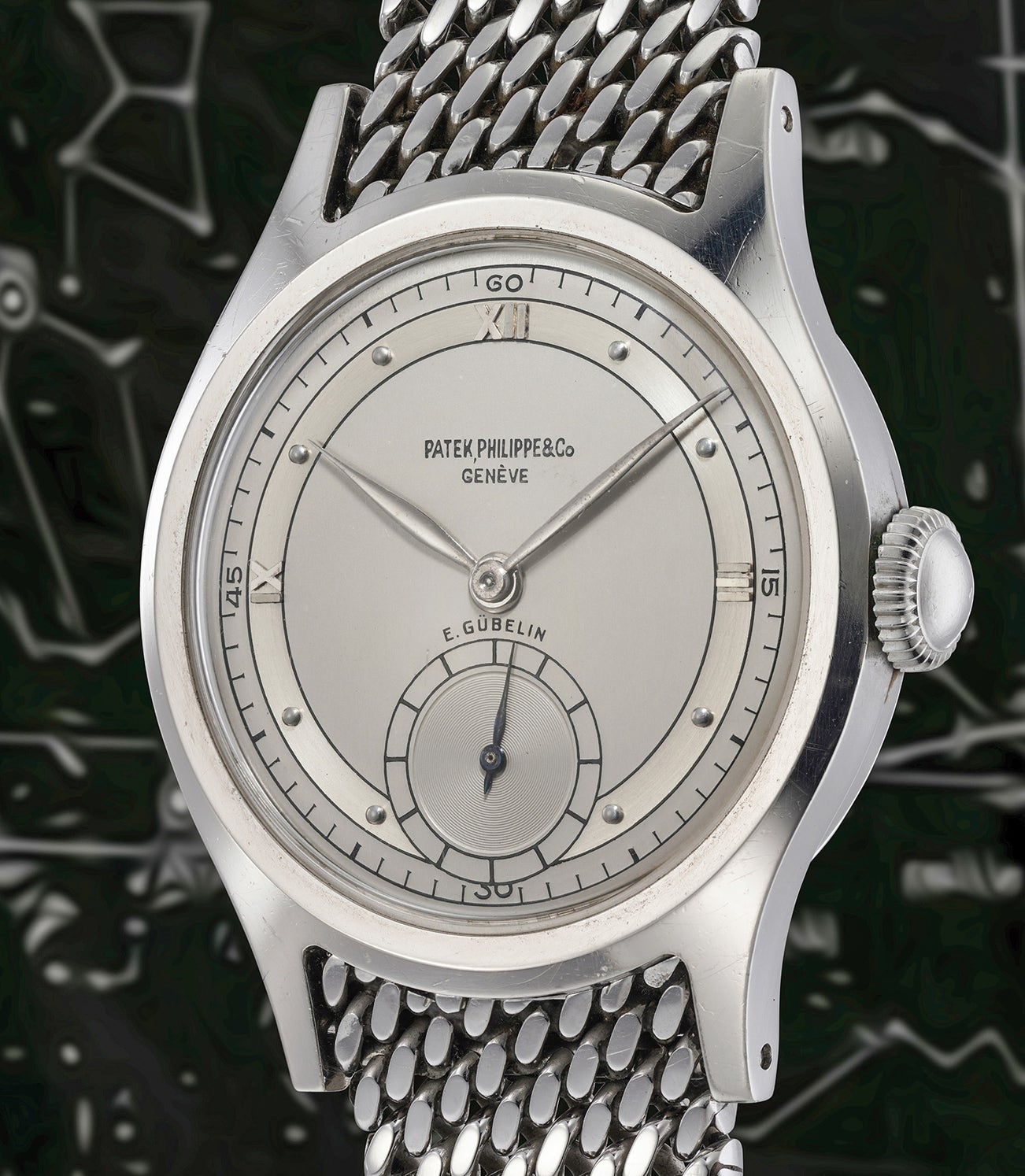 The present watch represents a “summa” of virtually all traits collectors lust after when looking at vintage time-only Patek Philippe pieces: the stainless steel is as practical and understated as it is rare and collectible. The dial is a symphony of details, ranging from the applied Roman numerals, to the Gübelin signature, to the two-tone semi-sectorial design. And all of this preserved in absolutely gorgeous condition. Finally, the Gay Frères Milanese bracelet signed by Patek Philippe is not only an incredibly comfortable and attractive accessory, but furthermore a true collectible on its own.