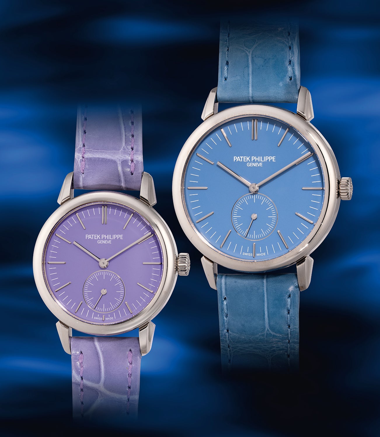 A pair of highly rare and attractive limited edition white gold wristwatches with small seconds, blue and violet dials, Certificates of Origin and presentation box, made exclusively for the Japanese market for the Patek Philippe Watch Art Grand Exhibition Tokyo