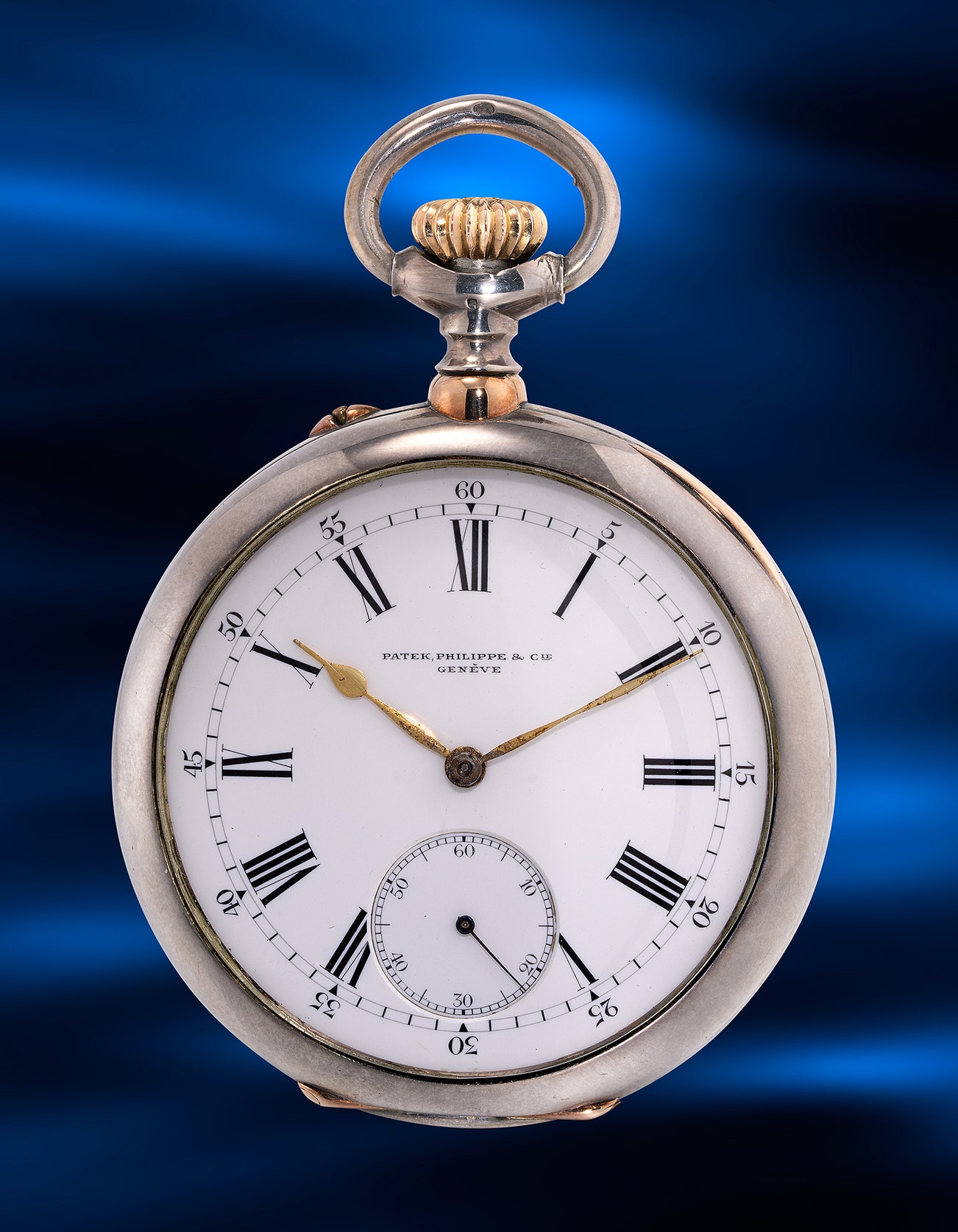 - Encased in silver, a rarity among Patek Philippe watches as most are predominantly crafted in 18K gold. In these rare cases, pink gold is usually used for crafting the crown, pendant neck, lip, and hinges to provide an elegant contrast to the silver case. Over the years, an attractive patina has developed on the surface, imparting a unique character to this fine timepiece. It features a crisp white enamel dial with a small seconds sub-dial, while the gold hands offer a striking contrast, showcasing the watch’s tasteful execution both inside and out.