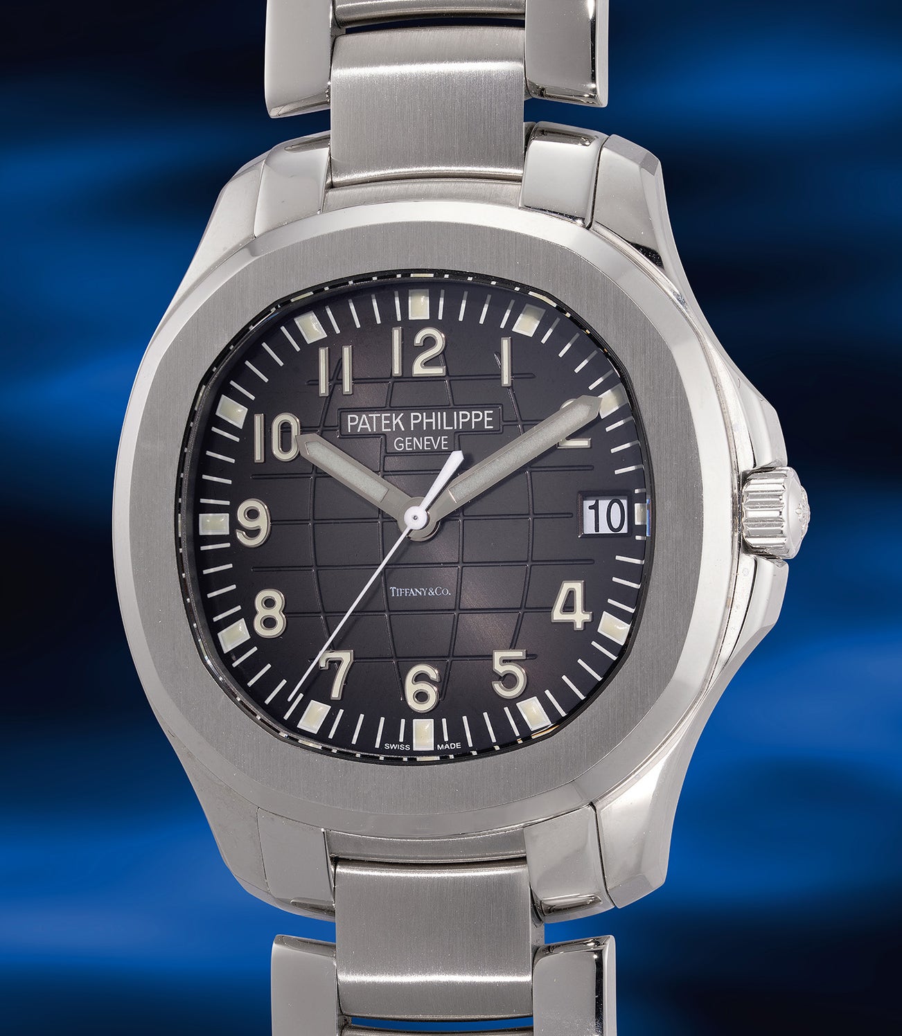 A very fine and highly rare double-signed stainless steel wristwatch with center seconds, date, bracelet, Certificate of Origin and presentation box, retailed by Tiffany & Co.