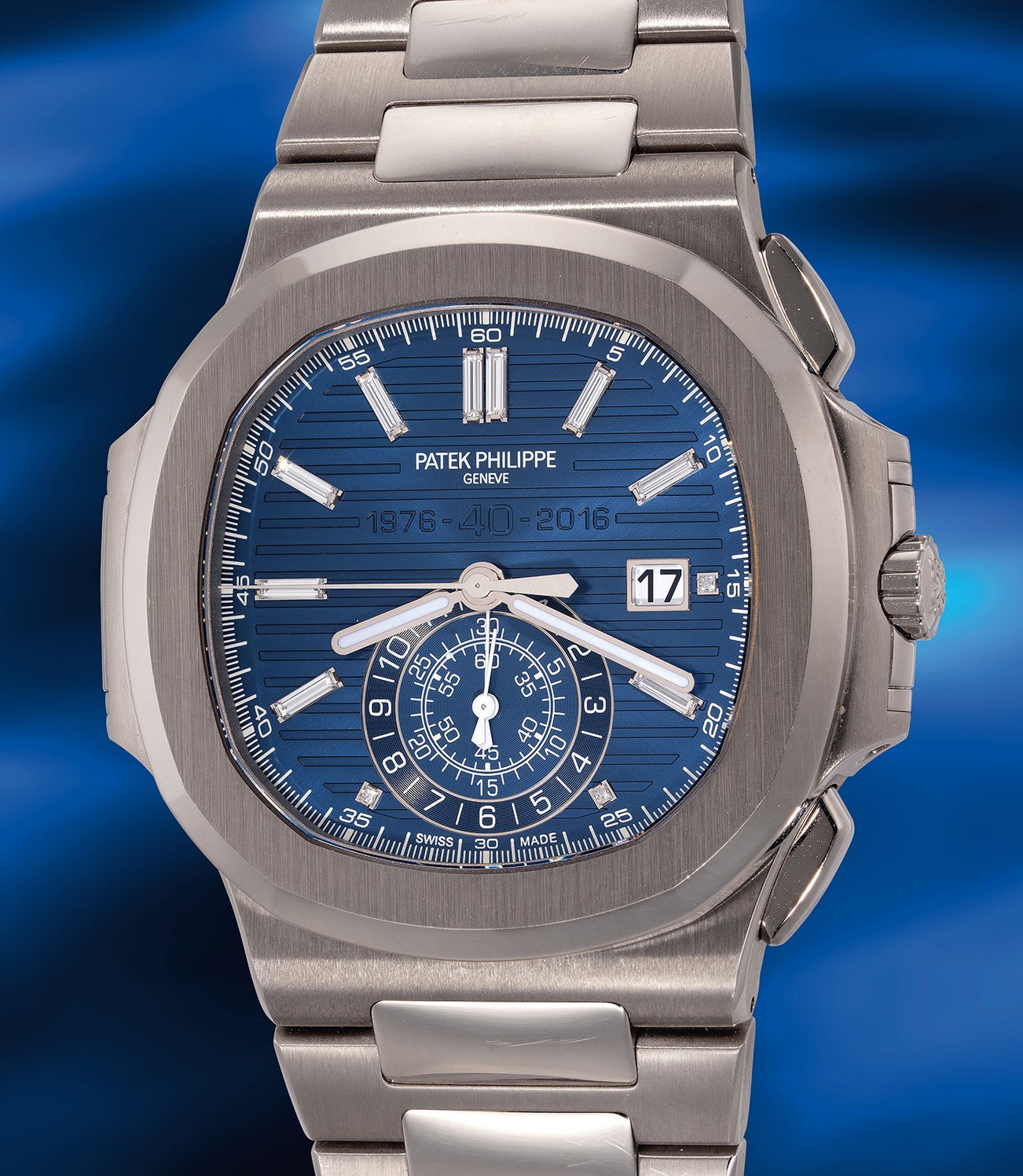 A massive, very rare and highly attractive white gold and diamond-set flyback chronograph wristwatch with bracelet, date, Certificate of Origin, setting pin and presentation box, made in a limited edition of 1,300 pieces to commemorate the 40th anniversary of Patek Philippe Nautilus