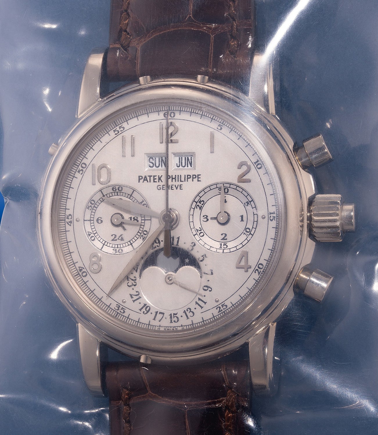 An exceedingly rare, important and elegant white gold perpetual calendar split-seconds chronograph wristwatch with moon phases, leap year, 24 hours indicator, Certificate of Origin, additional solid caseback and box, single-sealed