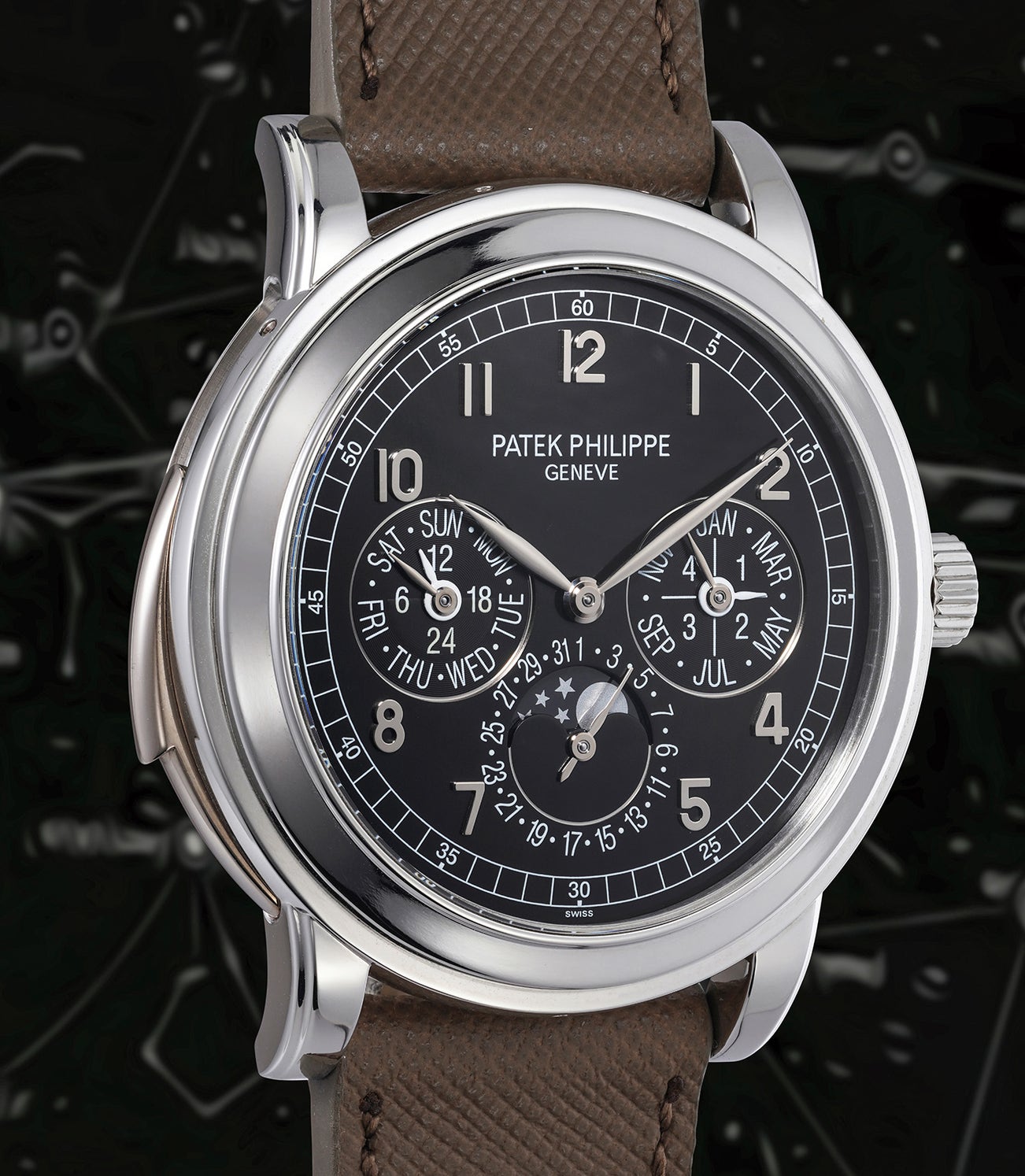 A very rare platinum automatic minute repeating perpetual calendar wristwatch with moon phases, 24 hours, leap year indicator, additional caseback, original certificate and fitted presentation box