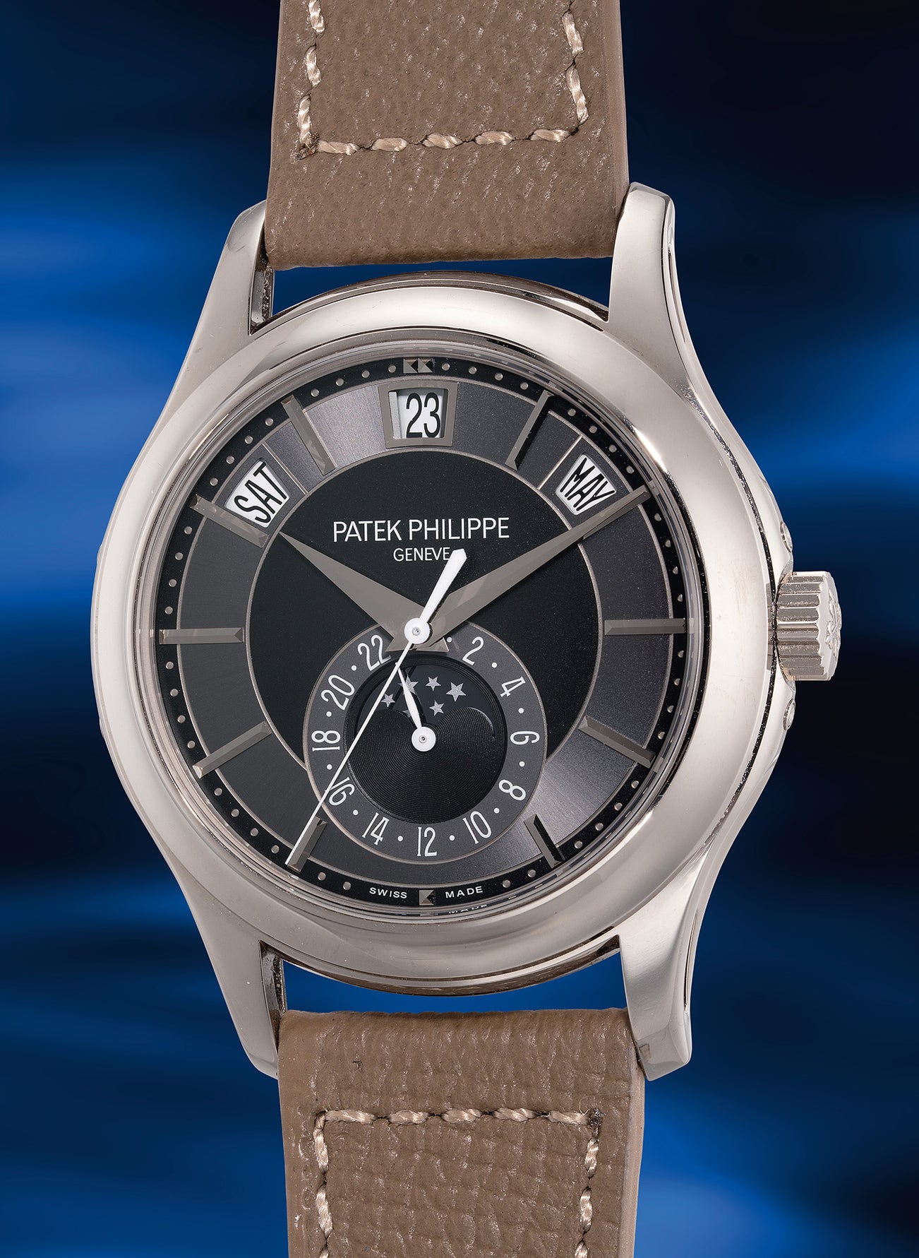 The 40mm case, crafted in 18k white gold, houses the self-winding caliber 324, a movement renowned for its precision and reliability. The annual calendar display is elegantly arranged in three apertures, while the moon phase indicator at 6 o’clock adds a touch of poetic charm. The sapphire crystal caseback reveals the meticulously finished movement, adorned with Geneva striping and perlage.