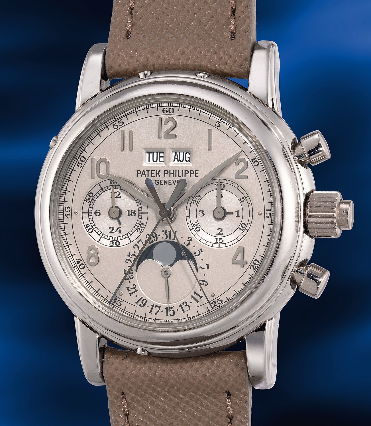 Measuring an elegant 36mm in diameter, the watch strikes the perfect balance between size and aesthetics, sharing design elements with references 3970, 2499, and 1518. Its stepped case is slightly thicker and larger than its predecessors, accommodating the split-seconds complication and lending a contemporary presence to the wrist. Featuring an oversized crown at 3 o’clock and a subtle silvered dial with applied Arabic numerals, this platinum example exudes a harmonious blend of simplicity, modern aesthetics, and traditional craftsmanship—a winning combination that makes it one of the most desirable and versatile wristwatches.