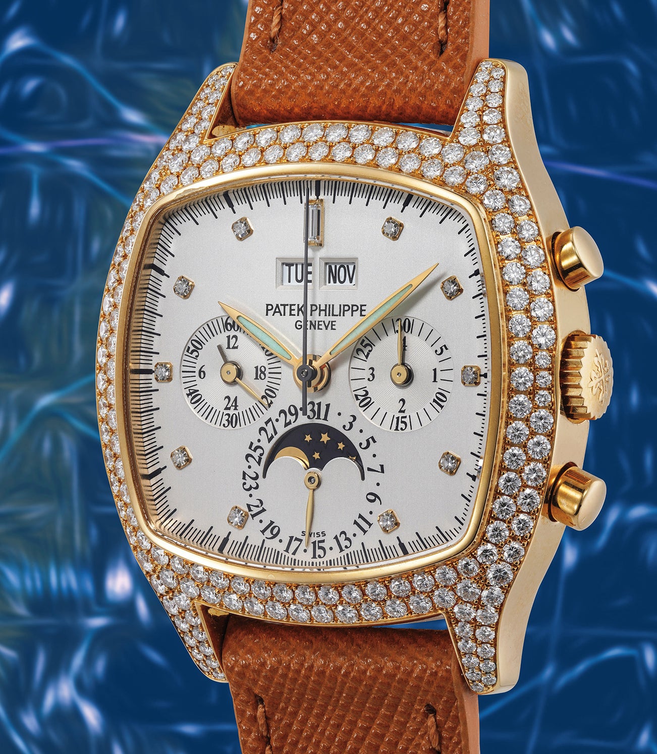 A superb, lavish and the only example so far publicly known of a yellow gold and diamond-set perpetual calendar chronograph wristwatch with 24-hour indication, diamond-set numerals, luminous hands, cushion case, certificate, additional caseback and box