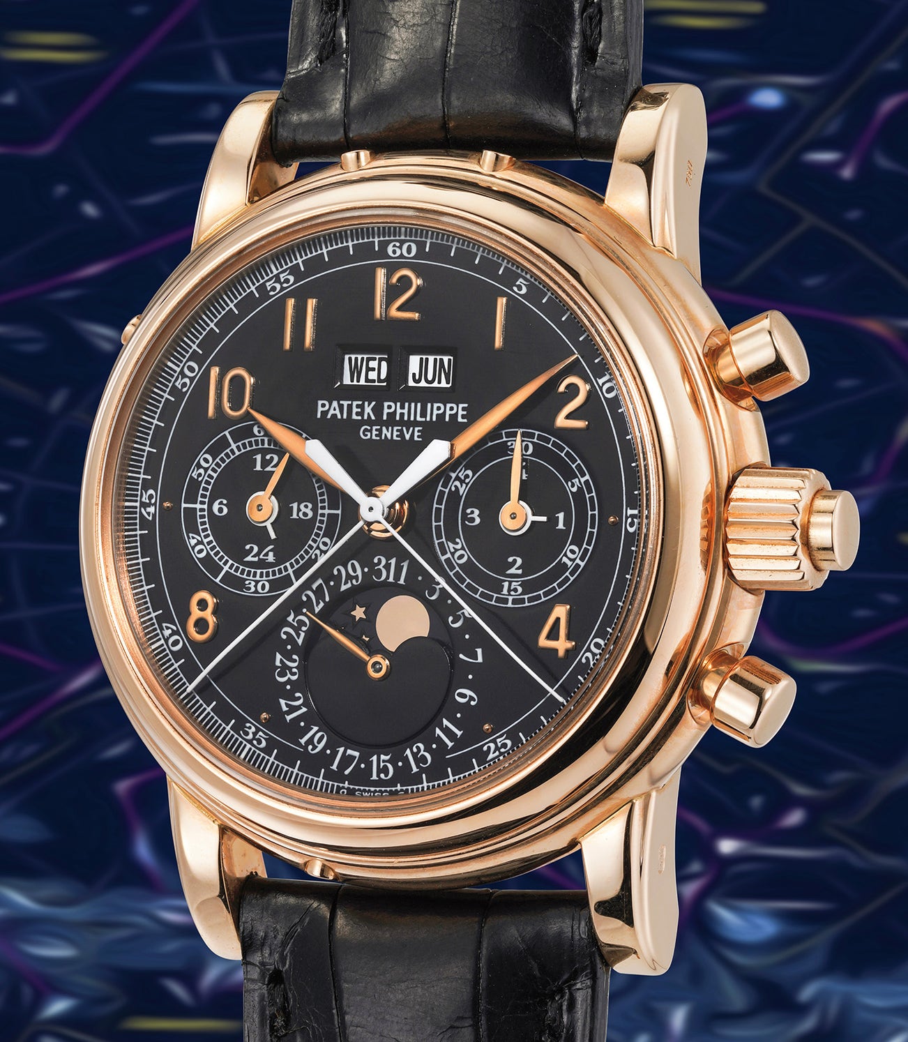 A superb and exceedingly rare pink gold perpetual calendar split seconds chronograph wristwatch with moonphases, 24 hour indication, leap year indicator, black dial, original certificate, additional caseback and fitted presentation box
