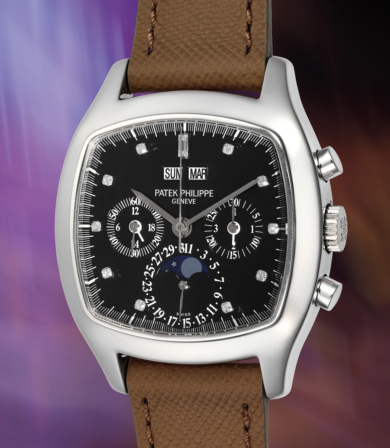 An exquisite and rare cushion-shaped platinum perpetual calendar chronograph wristwatch with moon phases, black dial and diamond-set hour markers, Certificate of Origin, and presentation box