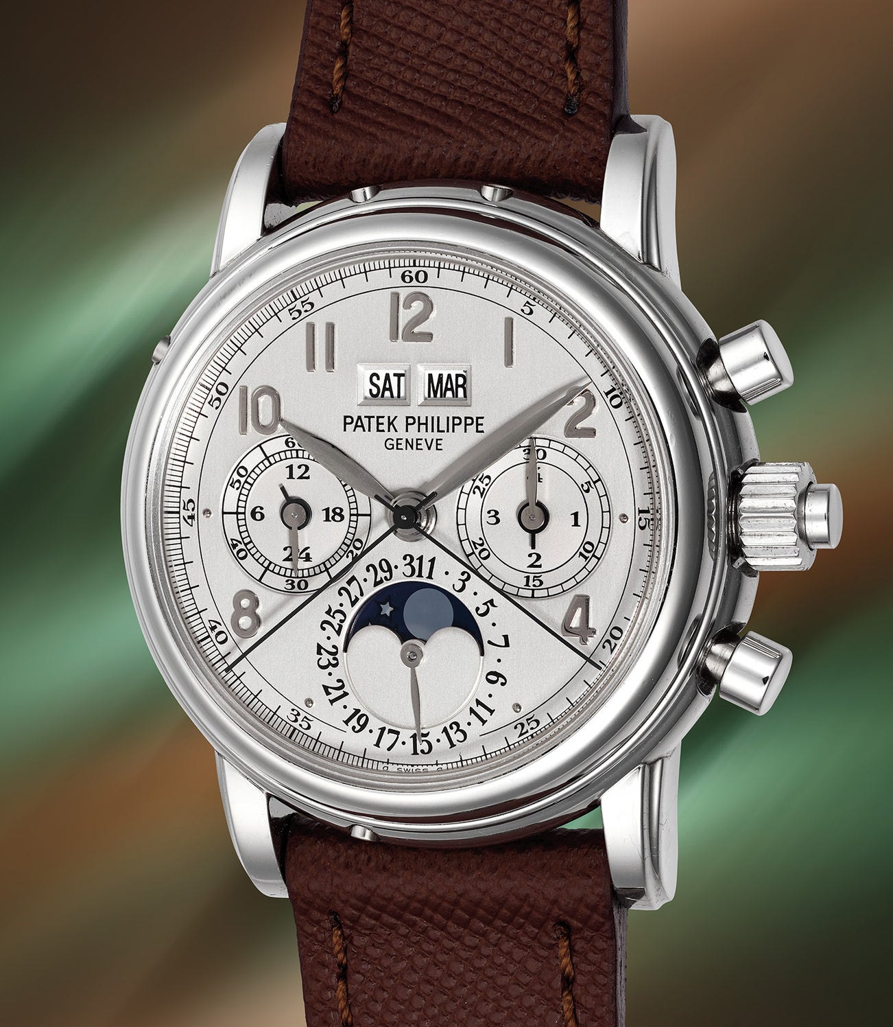 Not too small nor too large, the watch measures an elegant 36mm diameter and shares the aesthetics of the long lineage of perpetual calendar chronographs such as the reference 3970 and the iconic references 2499 and 1518. Yet, its stepped case is a little bit thicker and larger than its predecessors to accommodate the split-second complication, giving the watch a contemporary presence to the wrist. Displaying an oversized crown at 3 o’clock and an understated silver dial with applied Arabic numerals, the present platinum example exudes a potent mix of simplicity, modern aesthetics, and traditions; a winning combination to create one of the most desirable and versatile wristwatches.