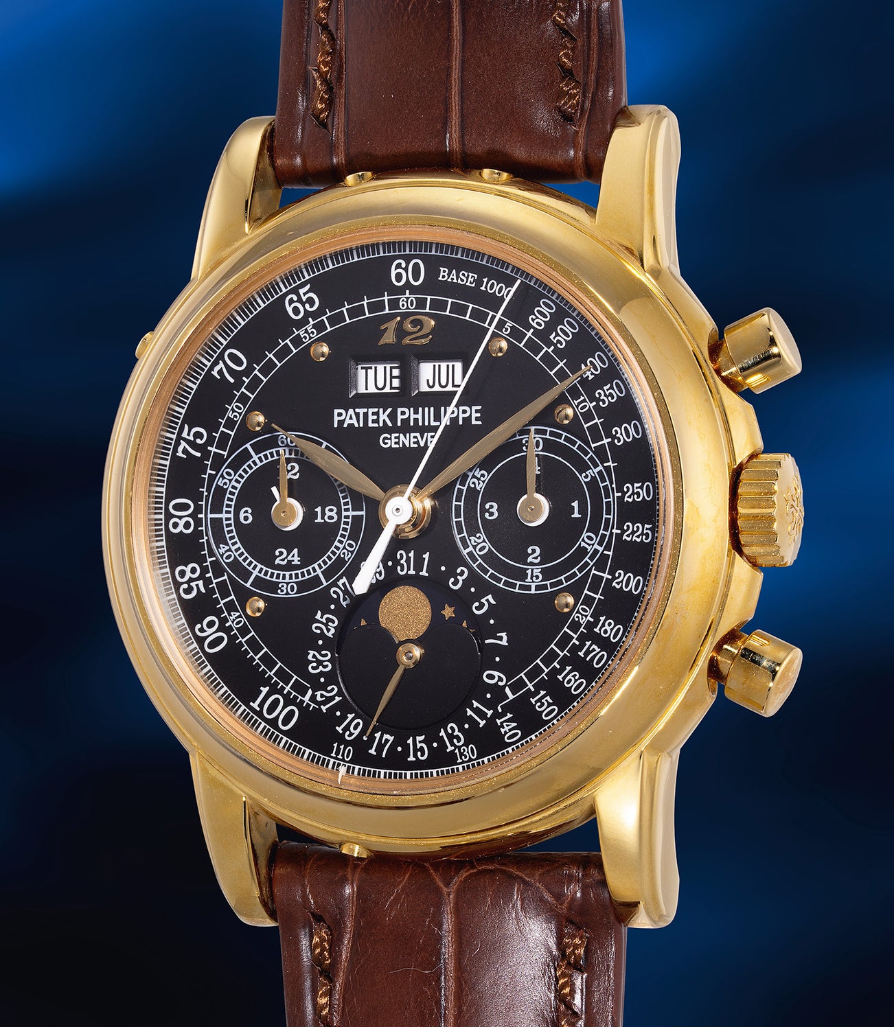 A “like-new”, exceptionally rare and elegant yellow gold perpetual calendar chronograph wristwatch with moon phases, black dial, Breguet numeral at 12 o'clock, tachymeter scale, 24-hour, leap year indication, additional solid caseback, setting pin, Certificate of Origin and presentation box, one of only two known