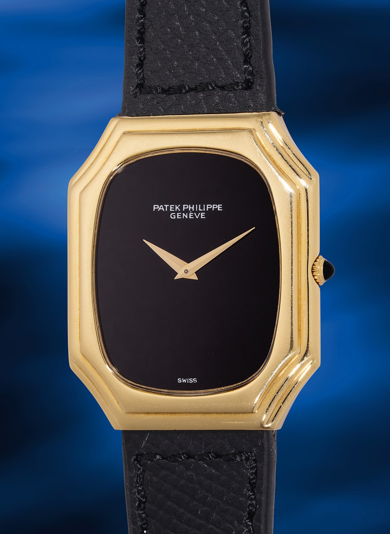 A spectacular design both visually and in terms of wearability, the present yellow gold ref. 3629 from circa 1977 with an onyx dial is the perfect example. Crafted by Ateliers Réunis (Key 28) and powered by the manual wind cal. 177, the present timepiece is an exceptionally elegant and rare creation from Patek Philippe. A “HOX” stamp on the inside of the caseback indicates that the watch was imported to the United States. With stone dials being known to be fragile, the present onyx dial is well-preserved with no signs of fissure or cracks. The lug-less design allows the beholder to admire the perfectly proportioned case in all of its unabashed geometrical beauty.