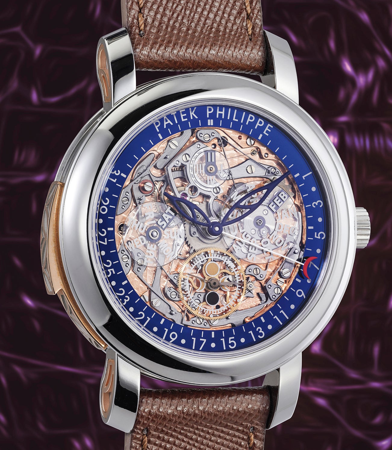 An exceptional, highly impressive and rare two tone platinum and pink gold automatic semi-skeletonised minute repeating perpetual calendar wristwatch with small seconds, retrograde date, moonphases and leap year indication