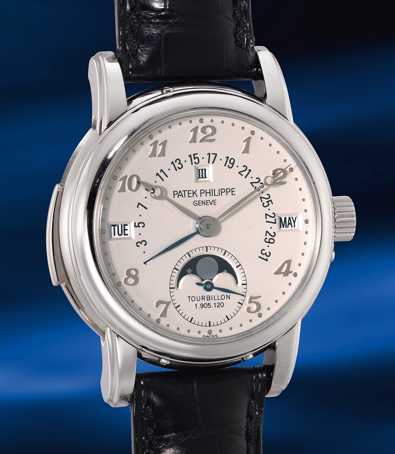 An exceedingly rare and important platinum minute repeating perpetual calendar tourbillon wristwatch with retrograde date, small seconds, moon phases, leap year indication, silvered Breguet numerals dial, Certificate of Origin, additional solid caseback, setting pin and presentation box