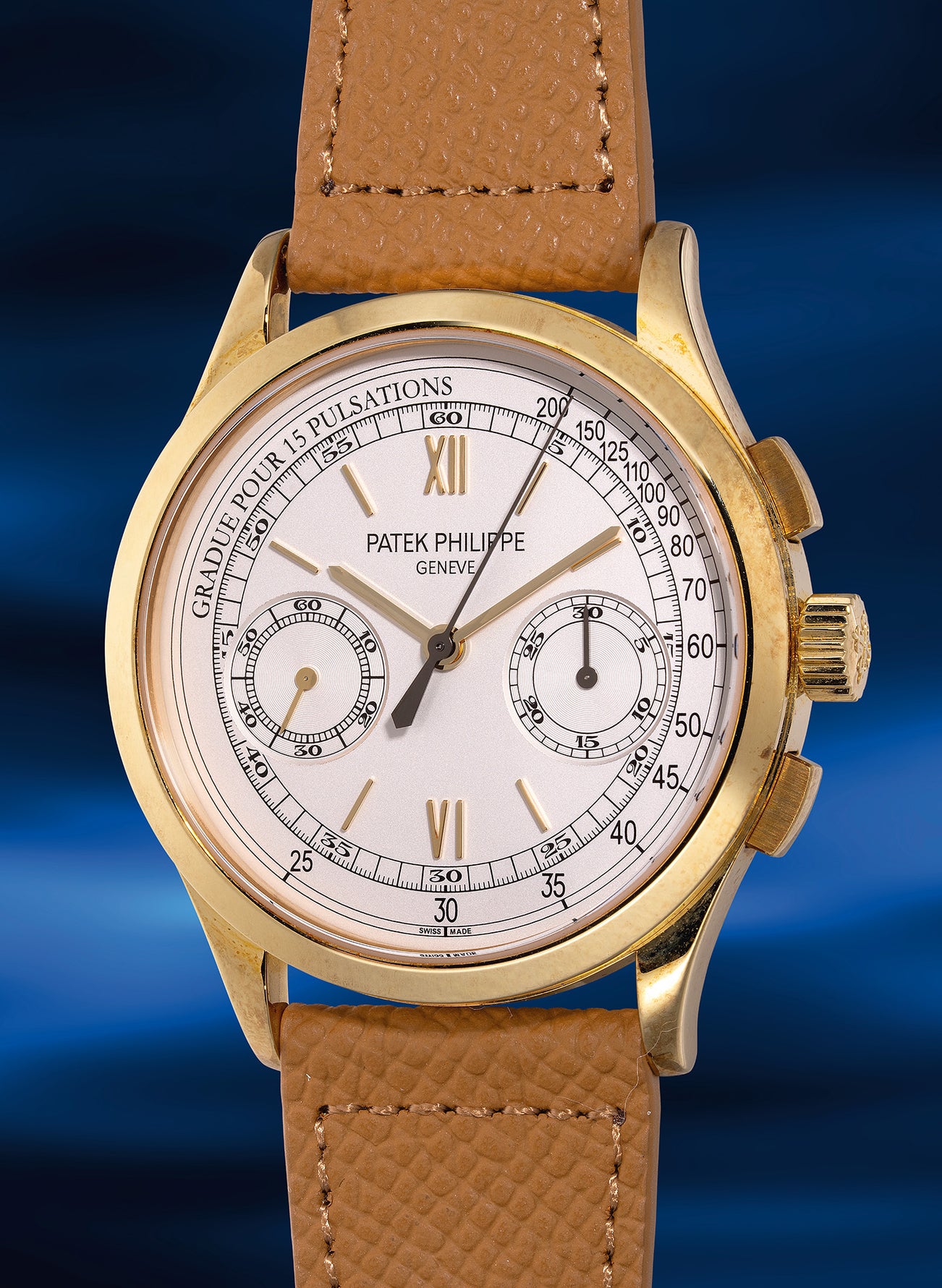 The 5170J embodies the quintessential Patek Philippe chronograph aesthetic, featuring harmonious case proportions and a simple two-register dial layout. It balances an inner minute ring with an outer pulsometer scale and the dial is adorned with applied baton hour markers and Roman numerals at 12 and 6 o’clock—an arrangement exclusive to the yellow gold model.