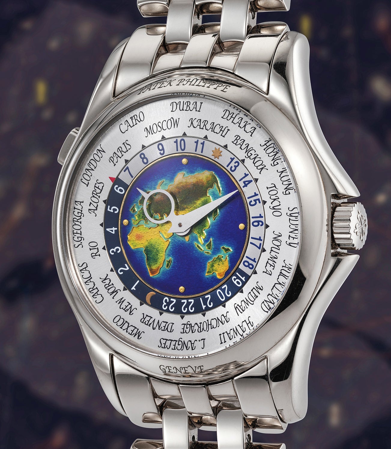 Reference 5131 was introduced in 2008 in yellow gold and subsequently in white gold (2009) and pink gold (2014), before a final edition in platinum in 2017 - interestingly featuring by default a bracelet, possibly the result of Patek Philippe being convinced by these previous on-demand specimens. Each metal features a different map, with this white gold version showcasing the eastern hemisphere: Europe, Africa, Asia and Australia. The model is inspired by the historical Patek Philippe world time ref. 1415, 605 and 2523, which as well were - in some rare instances - adorned with polychrome enamels representing geographical maps, now considered absolute masterpieces.