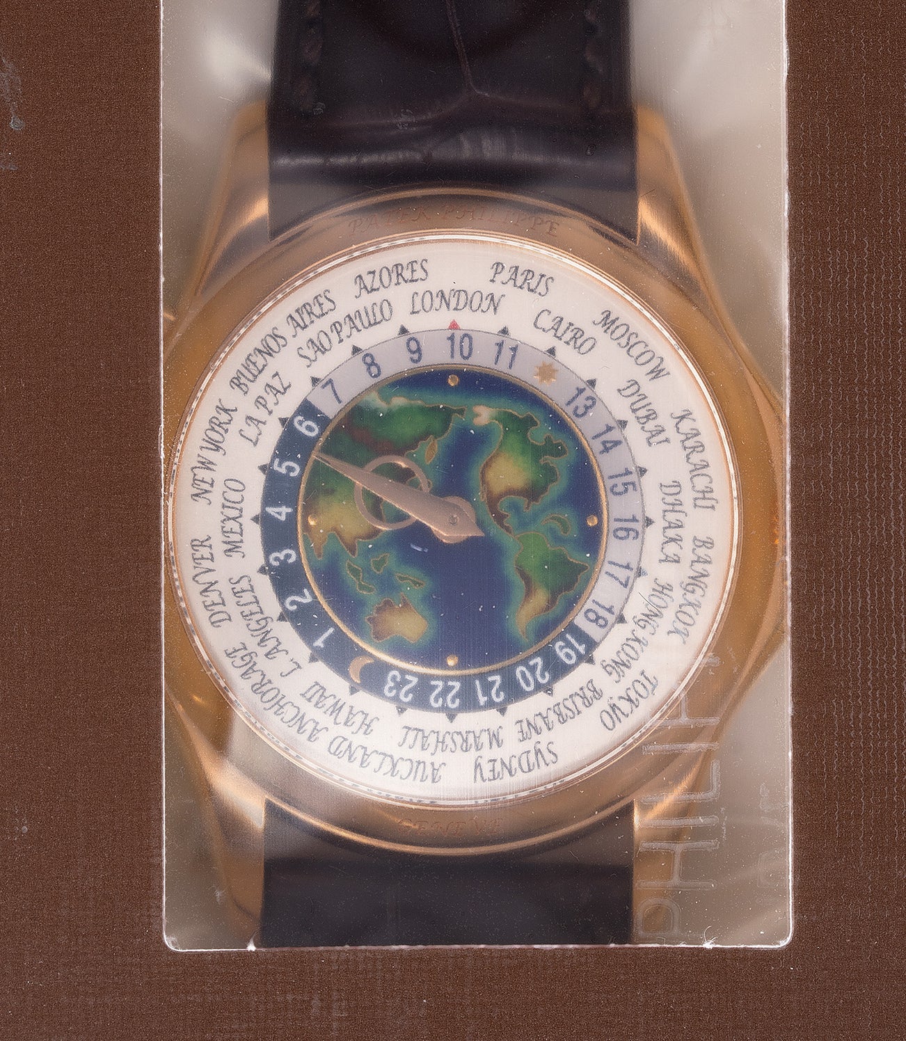 The present example Patek Philippe World Time ref. 5131R-010 features a beautiful cloisonné enamel dial depicting the continents of Asia, Americas and Oceana. Furthermore, the dial still features “Hong Kong” as one of the cities on the city ring, latter models features “Beijing” instead. Not only is this example complete with its full set of accessories, it remains in its double-factory-sealed condition like the day it was born from the manufacturer. Absolutely pristine and untouched, this ref. 5131R-010 is ready to kiss the wrist of a connoisseur for the first time.