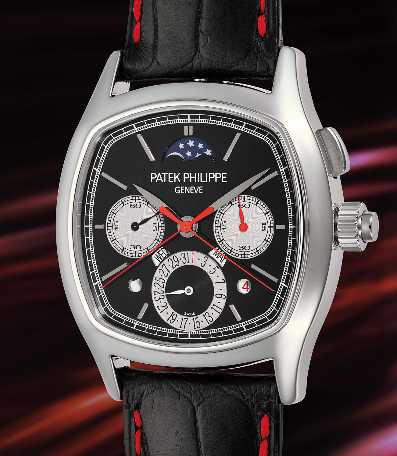 A highly sporty design - not only due to the red hands, but also to the contrasting counters and chapter ring - it is very far from the usual super complicated Patek Philippe dress watch, while at the same time being one of the most advanced timepieces made by the brand. It in fact employs what is the thinnest split seconds chronograph ever created by the company – also used for sister reference 5950. The caliber was then upgraded with a perpetual calendar module complete with moon phase, leap year, and day/night indication.