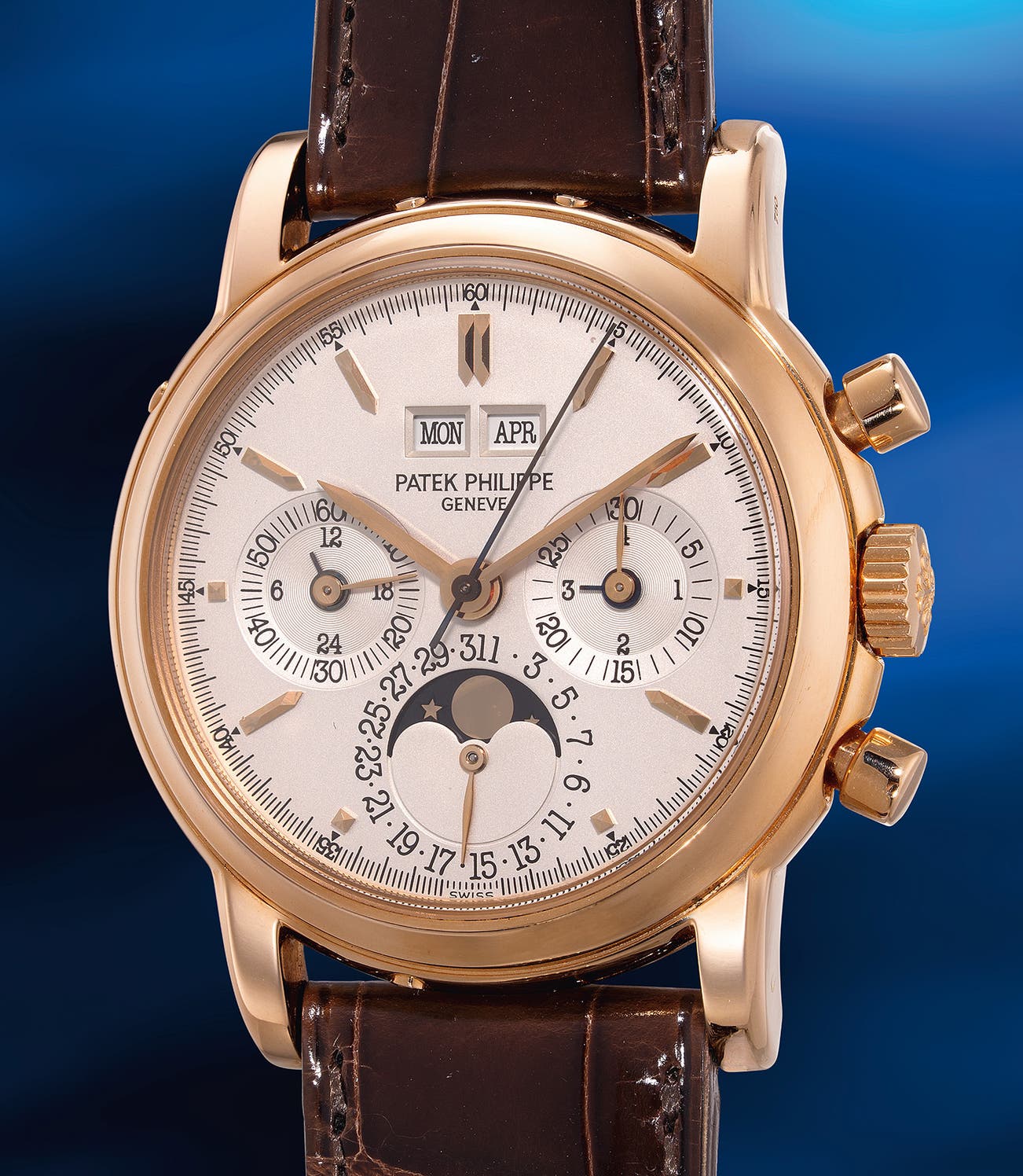 The present watch, a ref. 3970R‑014 in pink gold, belongs to the fourth series and carries a movement in the 3’046’XXX range, placing it among the final examples produced before the model’s discontinuation. It is preserved in highly attractive condition, with hallmarks visible still visible on all four lugs. Accompanied by its Certificate of Origin, additional solid caseback and setting pin—this fourth series ref. 3970 in elegant pink gold stands as a superb representative of one of Patek Philippe’s most revered modern grand complications, and will certainly appeal to the discerning collector seeking a timeless perpetual calendar chronograph.