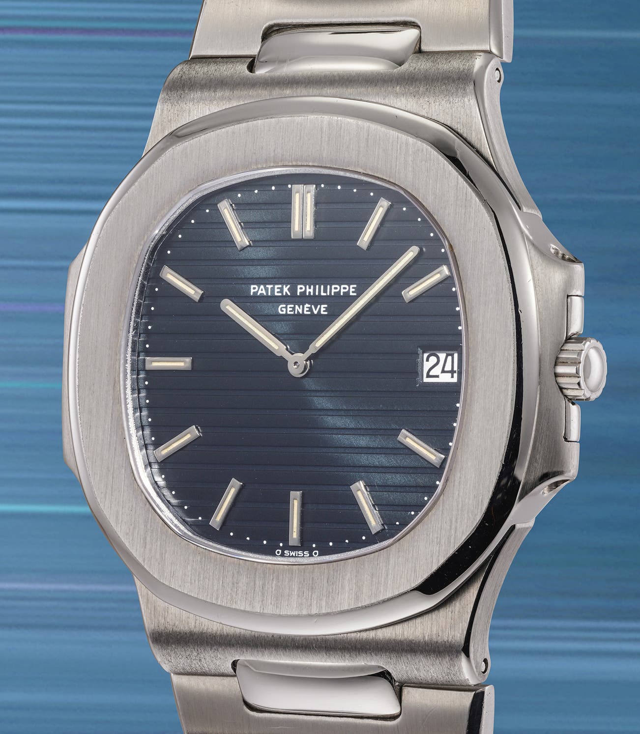 The result of a collaboration between Patek Philippe and designer Gérald Genta, the Nautilus' unique appearance was inspired by maritime portholes and named for Captain Nemo's submarine, the Nautilus, in Jules Verne's Twenty Thousand Leagues Under the Sea. Much as the fictional nautical vessel was described as "a masterpiece containing masterpieces," so does the Nautilus wristwatch possess a numerous variety of artistic cues. The reference 3700 embodies every aspect of Patek Philippe's avant-garde design philosophy of the 1970s, from the bold yet elegant curves, to the contrasting finish of the case, and even the delicate grooves of the dial culminating in a sublimely robust and elegant wristwatch. Its production is officially divided by Patek Philippe themselves into two distinct Series, with different reference numbers. The earliest specimens, such as the present one, belong to reference 3700/1 and present a larger, more robust bracelet tapering to 16mm. Later examples (from the early 1980s on) are dubbed 3700/11 and feature a 14mm tapering.