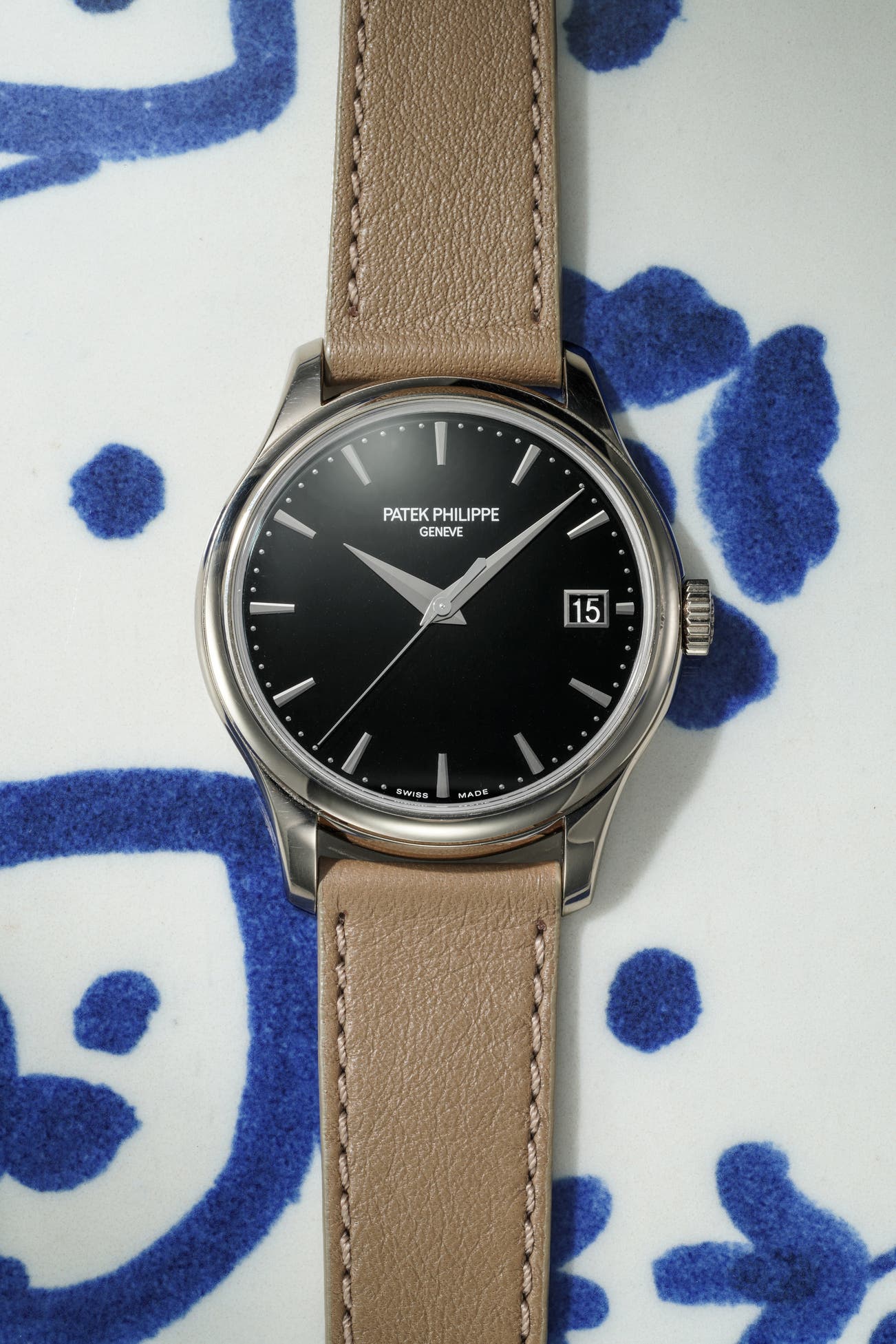 - The present example pairs a white gold case with a rich black lacquered dial. It stays true to the Calatrava’s timeless design while introducing a discreet officer-style hinged caseback—engineered over two years to reveal the finely finished movement.