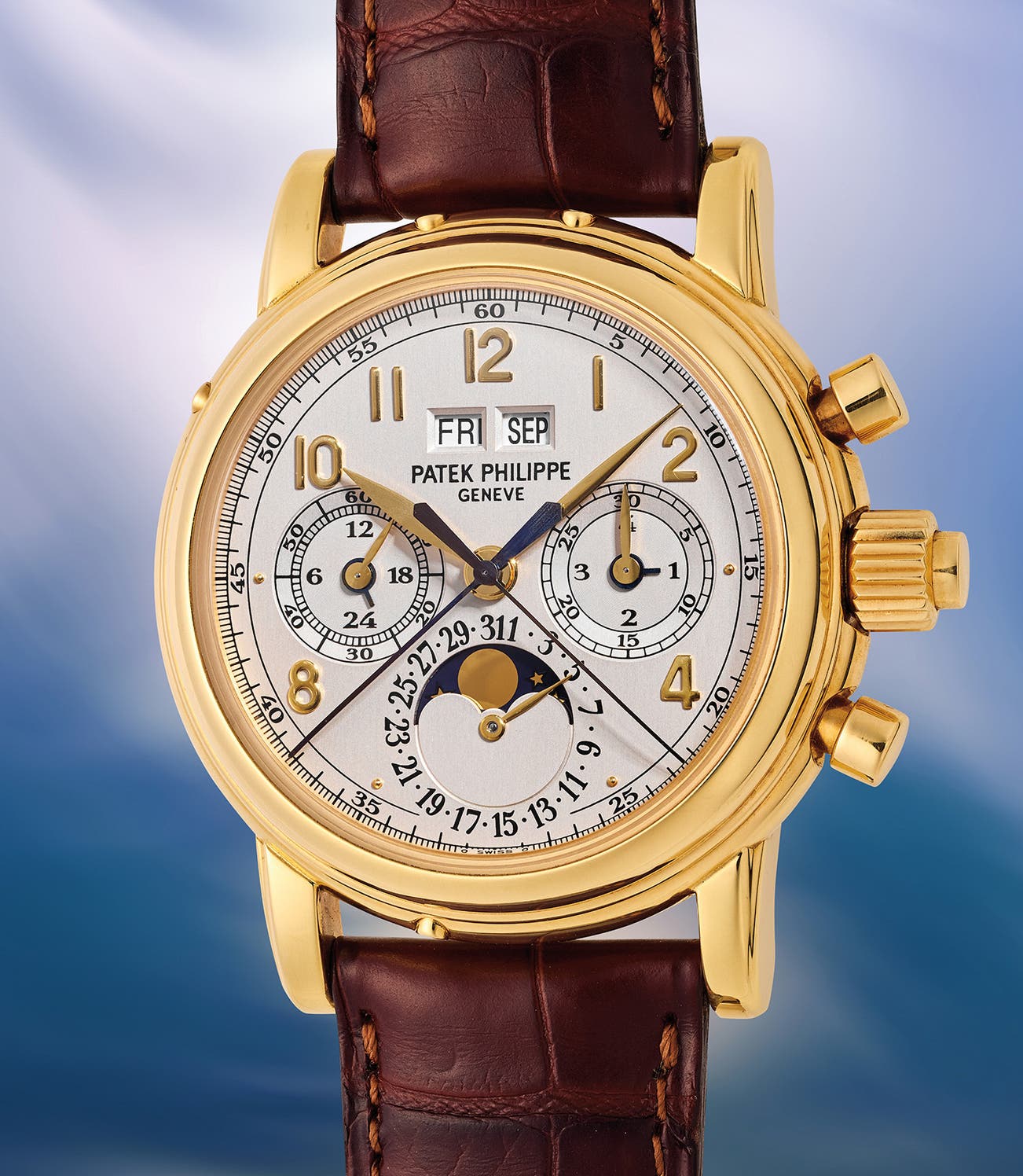 An exceptional and very rare yellow gold perpetual calendar split-seconds chronograph wristwatch with moon phases, 24-hour indicator, solid caseback, Certificate of Origin, and presentation box