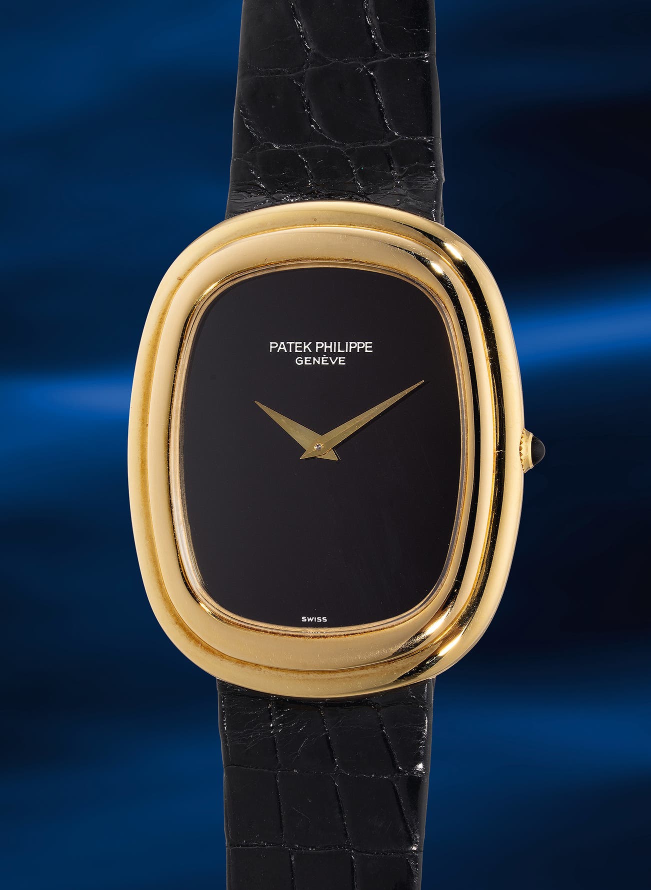 An exquisite, supremely attractive and well-preserved yellow gold wristwatch with onyx dial and onyx-set crown