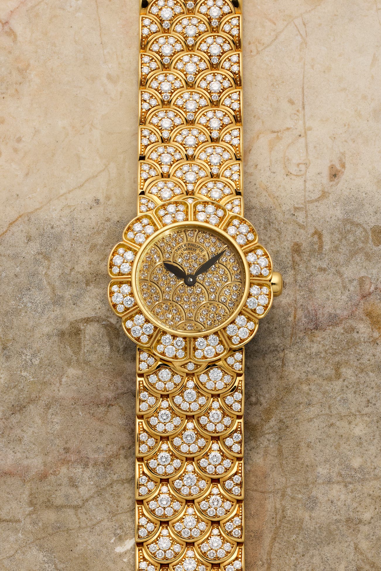 • The present lady’s Neptune is a wonderful representation of the modern aesthetic Patek Philippe brings to women’s timepieces. The Neptune is a lesser known collection first released in the mid 1990s with a mix of sporty and luxury timepieces. The present reference 4872 is the epitome of haute joaillerie watches. The cocktail bracelet watch functions both as a timepiece and jewellery piece. The diamond-set bezel creates a floral design around the pavé dial while the exquisiteness extends to the diamond-set bracelet. The watch is offered in excellent condition along with its Certificate of Origin and presentation box.