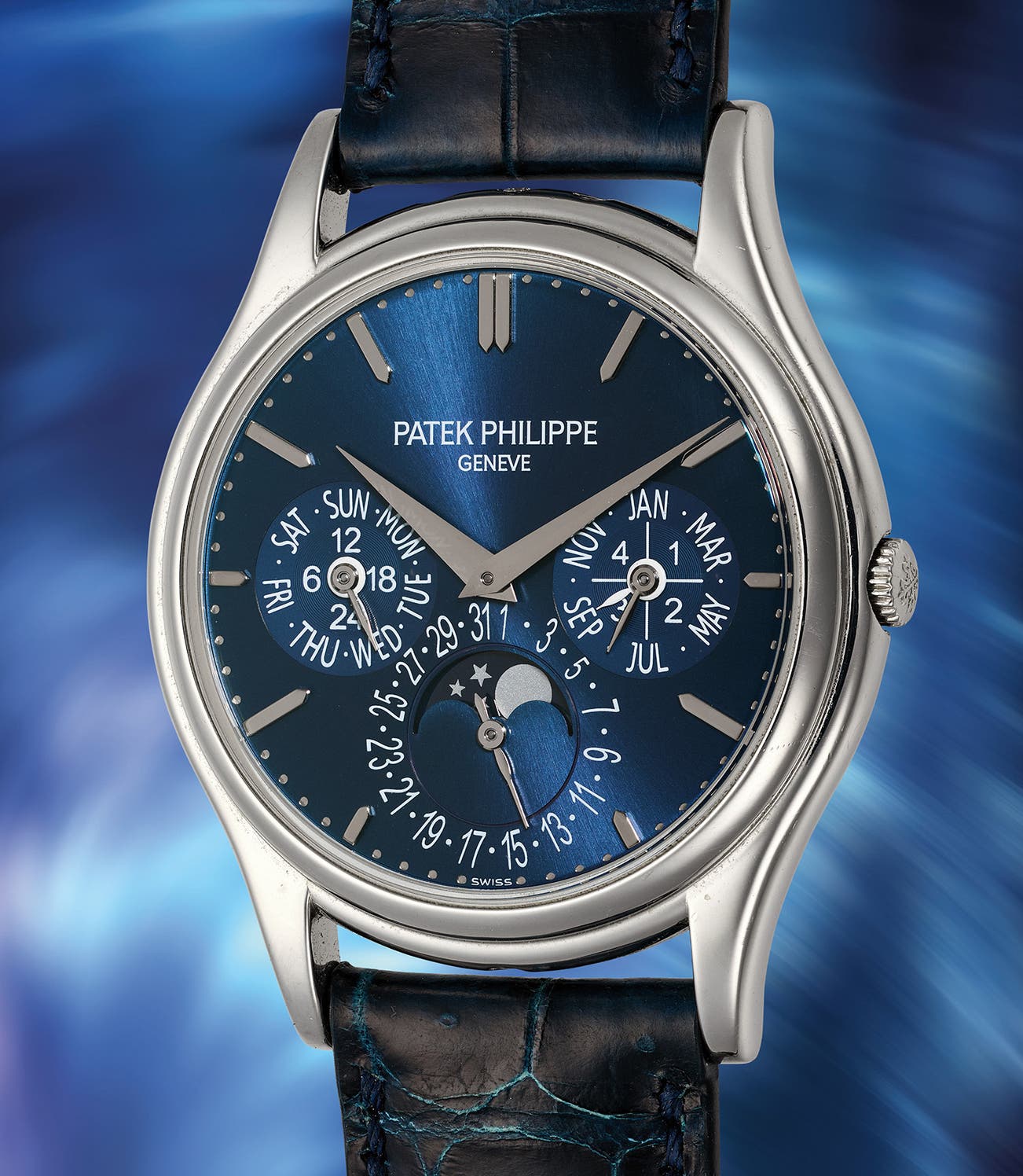 Crafted in platinum, the present example stands as the most visually striking of the entire lineage, featuring a mesmerizing blue sunburst dial that immediately distinguishes it from its counterparts. The metallic tone shimmers between deep navy and electric azure depending on the light, lending the watch a quiet grandeur—cool, reserved, and unmistakably modern. The elegant dauphine hands, applied white-gold indices, and discreet minute track all harmonize perfectly within the balanced tri-compax layout that has become synonymous with Patek Philippe’s perpetual calendars.
