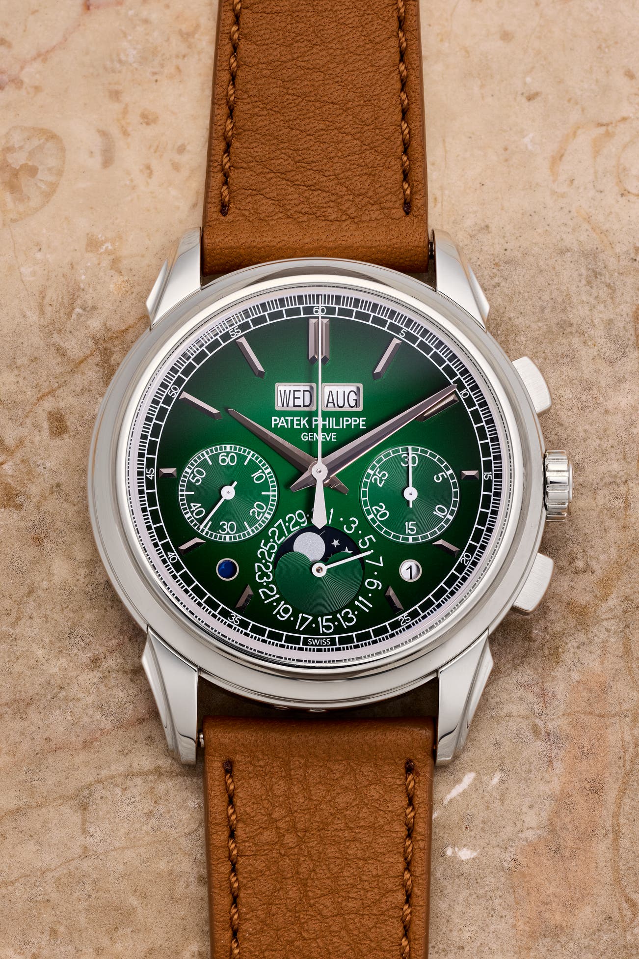 A very well preserved and vibrant perpetual calendar chronograph wristwatch with green dégradé dial, day/night indication, moon phase, leap year indication, additional solid caseback, Certificate of Origin, presentation box, and hang tag