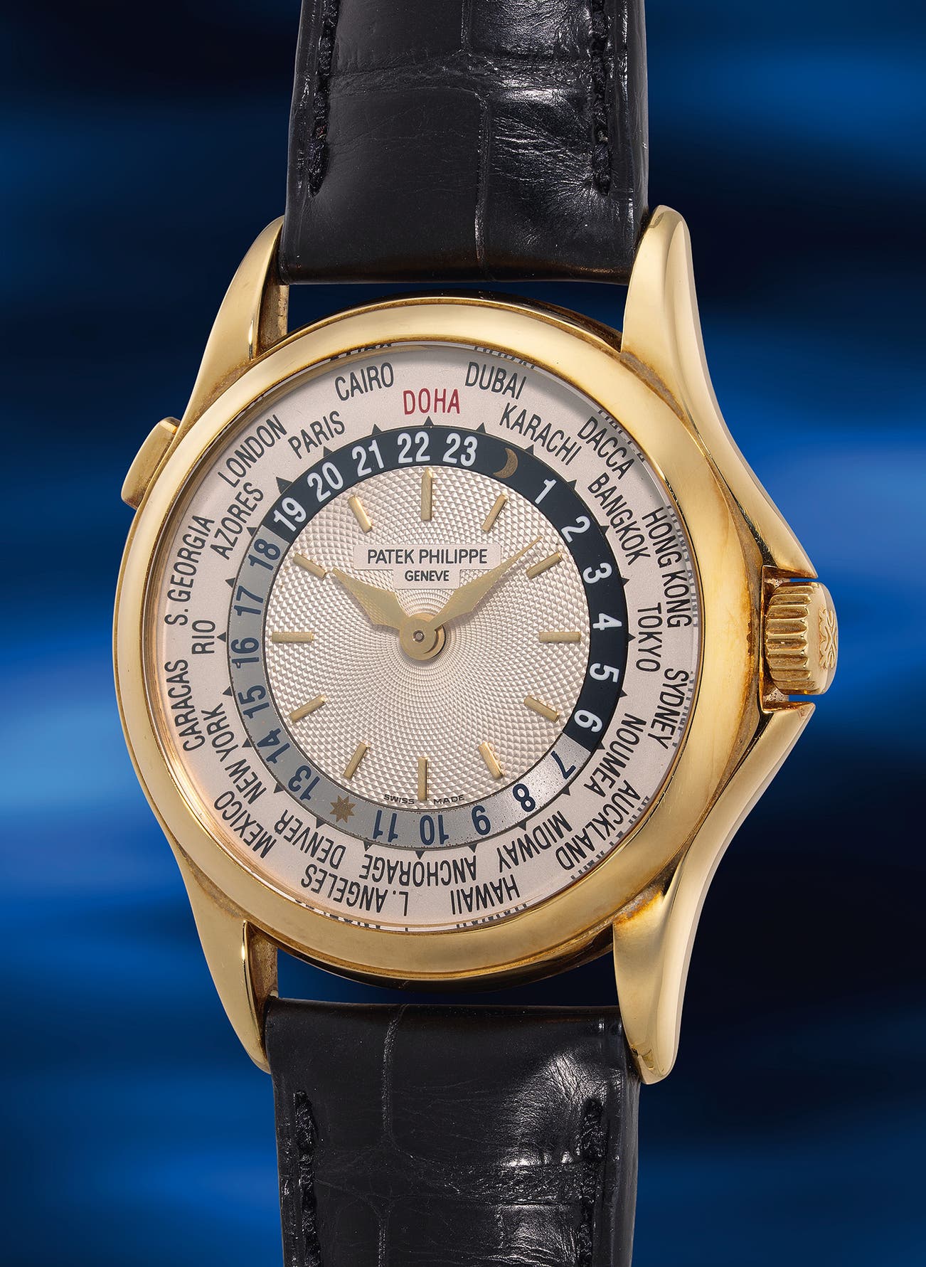 A rare and attractive yellow gold world time wristwatch with guilloché dial, made for the State of Qatar