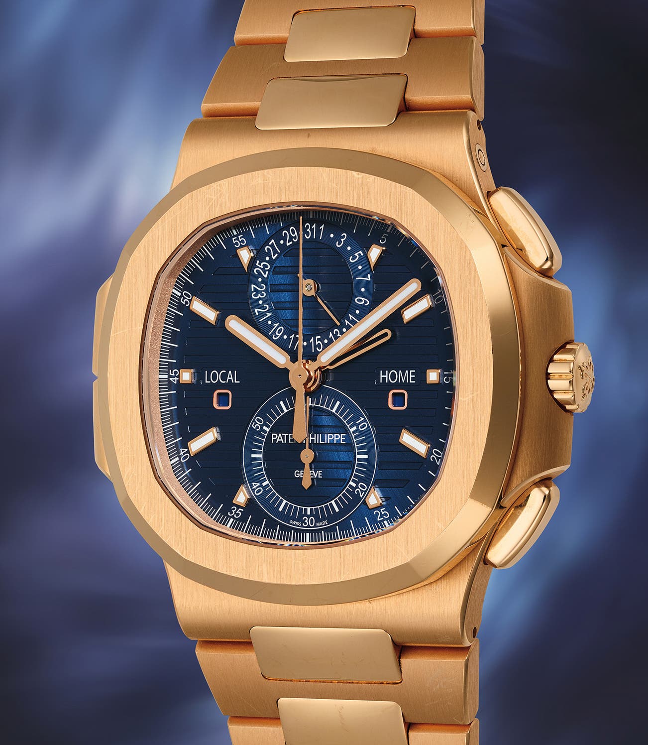 The pink gold iteration of the 5990, succeeding the steel case and grey dial combination, was first introduced to the market in 2021 and instantly received praise for the luxurious pink gold case and bracelet and beautifully contrasting navy blue dial. It is the ultimate in luxury sports watches, and the perfect travel companion with two essential complications.