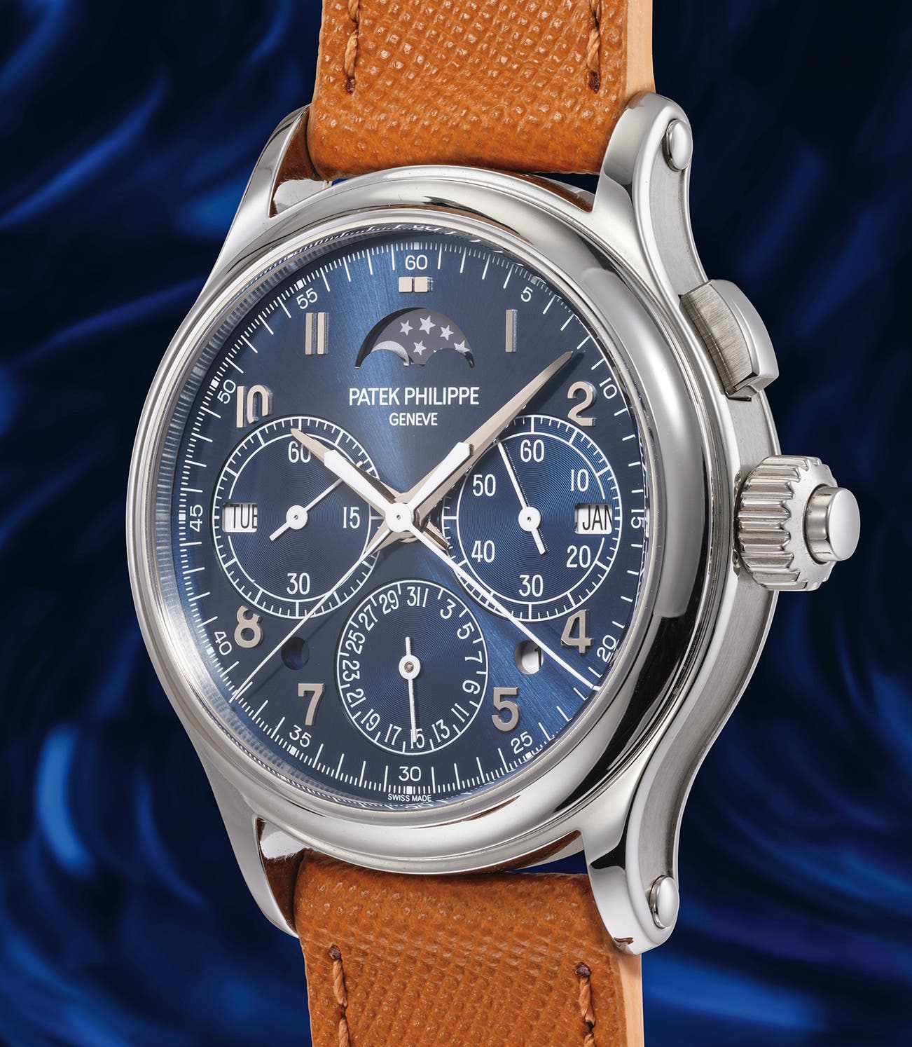 Discontinued in 2022, the present reference 5372P is so rare that it is only the 3rd example (2 with salmon dial and the present blue dial) to grace an international auction room