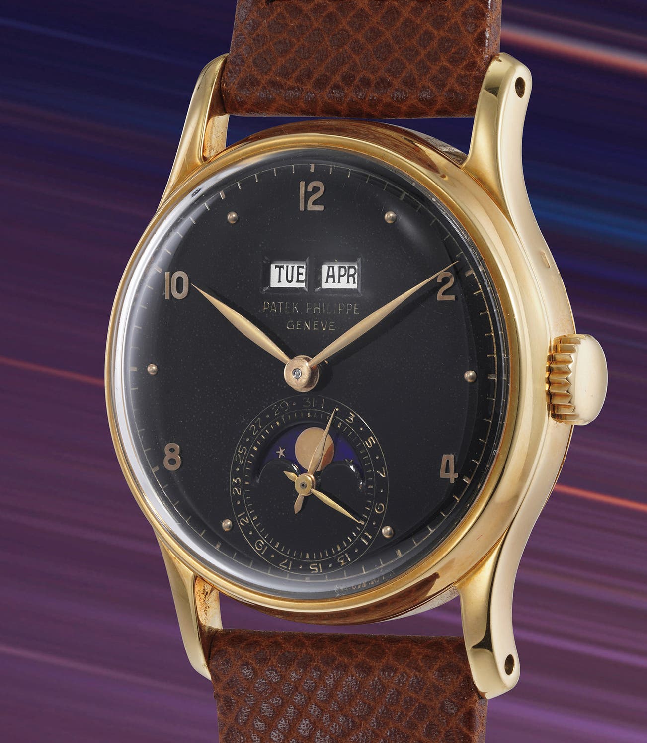 An incredibly attractive incredibly rare yellow gold perpetual calendar wristwatch with moonphases and black dial, only one known