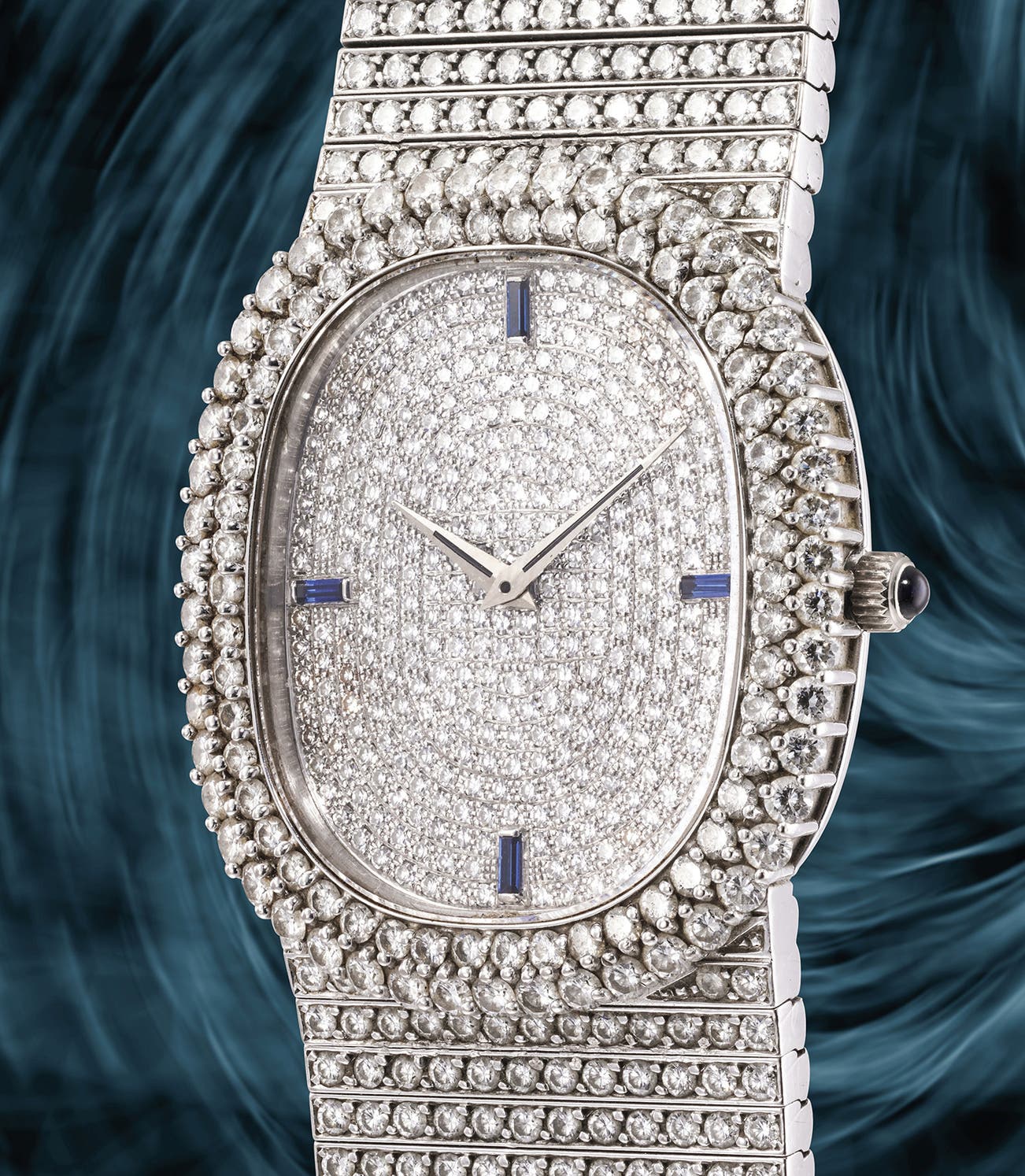 A dazzling and extremely rare white gold and diamond-set wristwatch with bracelet and sapphire hour markers