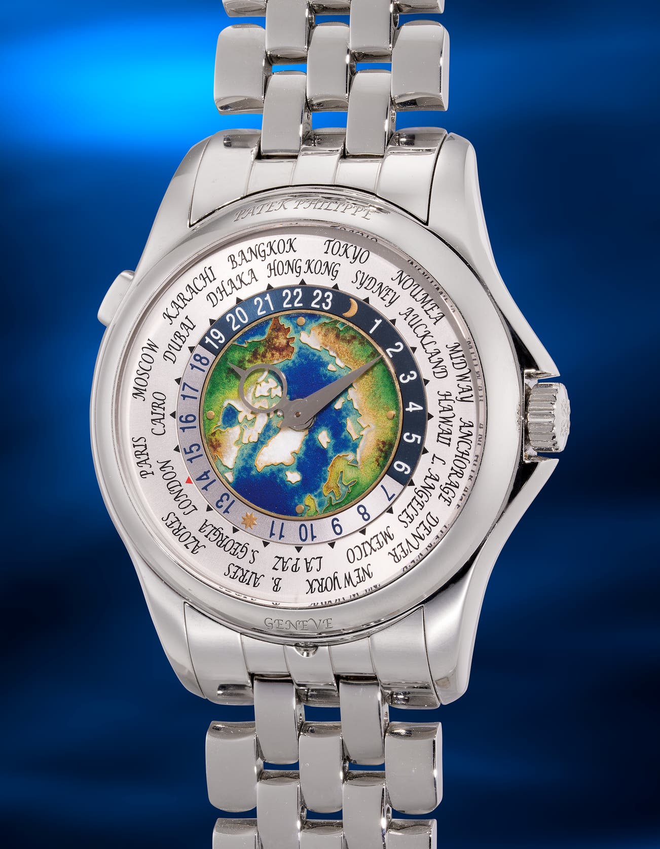 An exceptional, rare and well-preserved platinum world time wristwatch with bracelet, cloisonné enamel dial depicting the North Pole, Certificate of Origin and presentation box