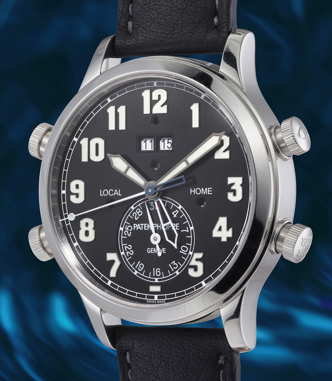 The present example, crafted in platinum, features a striking black dial with luminous markers, evoking the vintage Pilot watches of the mid-20th century. Rare and highly coveted, the reference 5520P has only appeared at auction on a handful of occasions, making this an exceptional opportunity for collectors. The present timepiece, having been serviced in July of this year is furthermore accompanied by its original accessories, including the Patek Philippe Certificate of Origin, portfolio photograph, product literature, additional caseback, setting pin, presentation box, and outer packaging.
