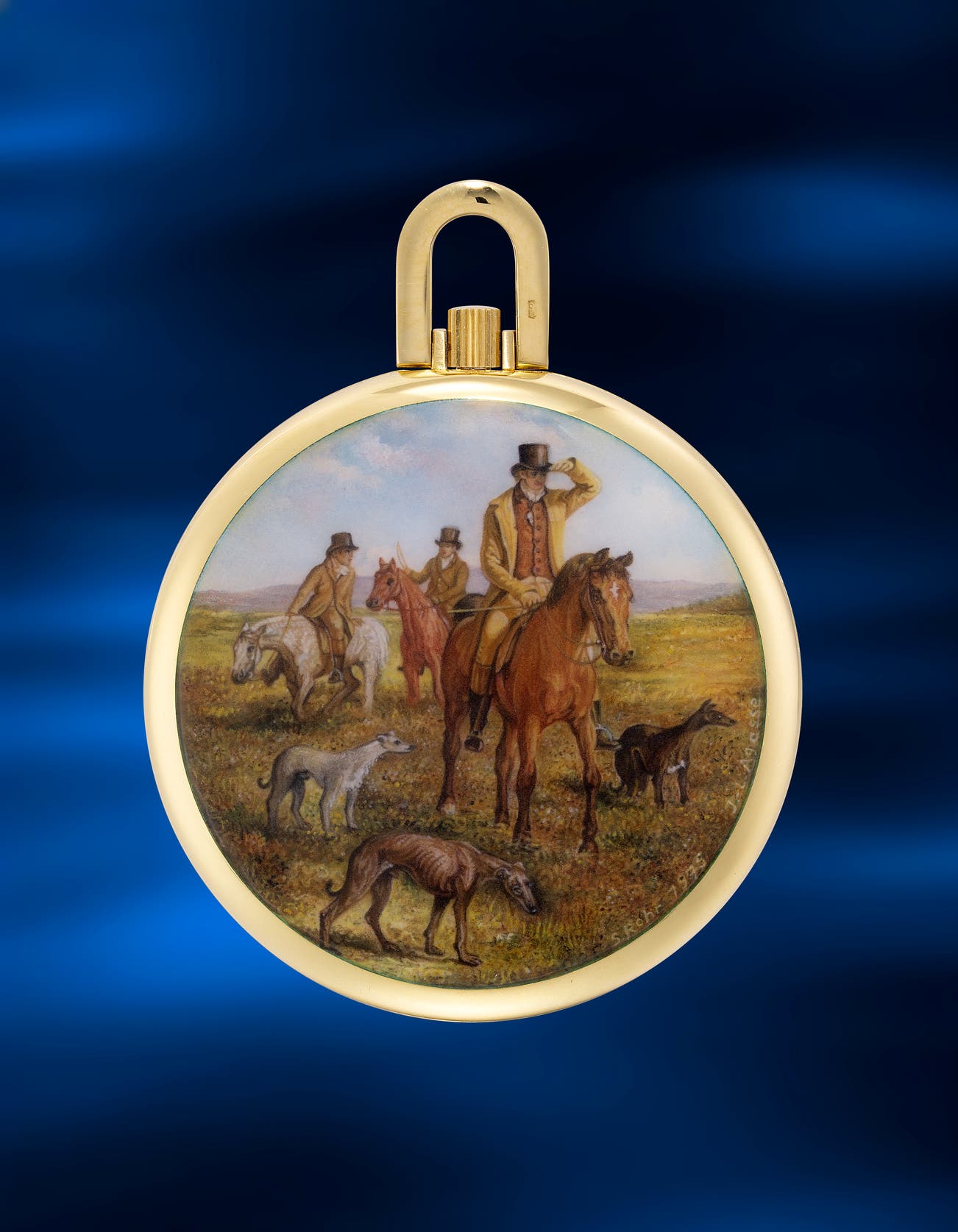 A unique, exceptionally fine and well-preserved yellow gold pocket watch with miniature enamel by Suzanne Rohr reproducing the painting “Lord Rivers and his friends” after Jacques-Laurent Agasse and Extract from the Archives—freshly unsealed from factory service-sealed condition