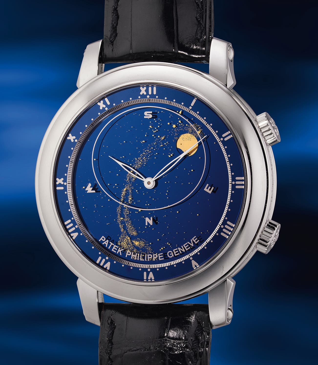 Hours and minutes are indicated by two skeletonized white-lacquered gold feuille hands, complemented by a subtle blue outer chapter ring with Roman numerals. The delicate elliptical contour on the inside of the glass frames the portion of the sky visible from all cities at the latitude of Geneva.