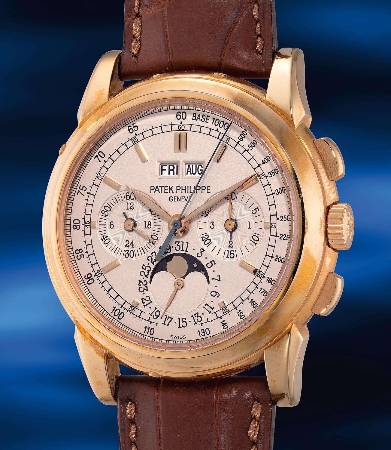 Fresh to the market and preserved in new-old-stock condition, the case has further developed a nice layer of patina throughout due to prolonged storage in the safe. This piece comes complete with its full set of accessories, including an additional caseback and setting pin. This represents a rare opportunity to acquire one of Patek Philippe’s last classic perpetual calendar chronograph models in pink gold.