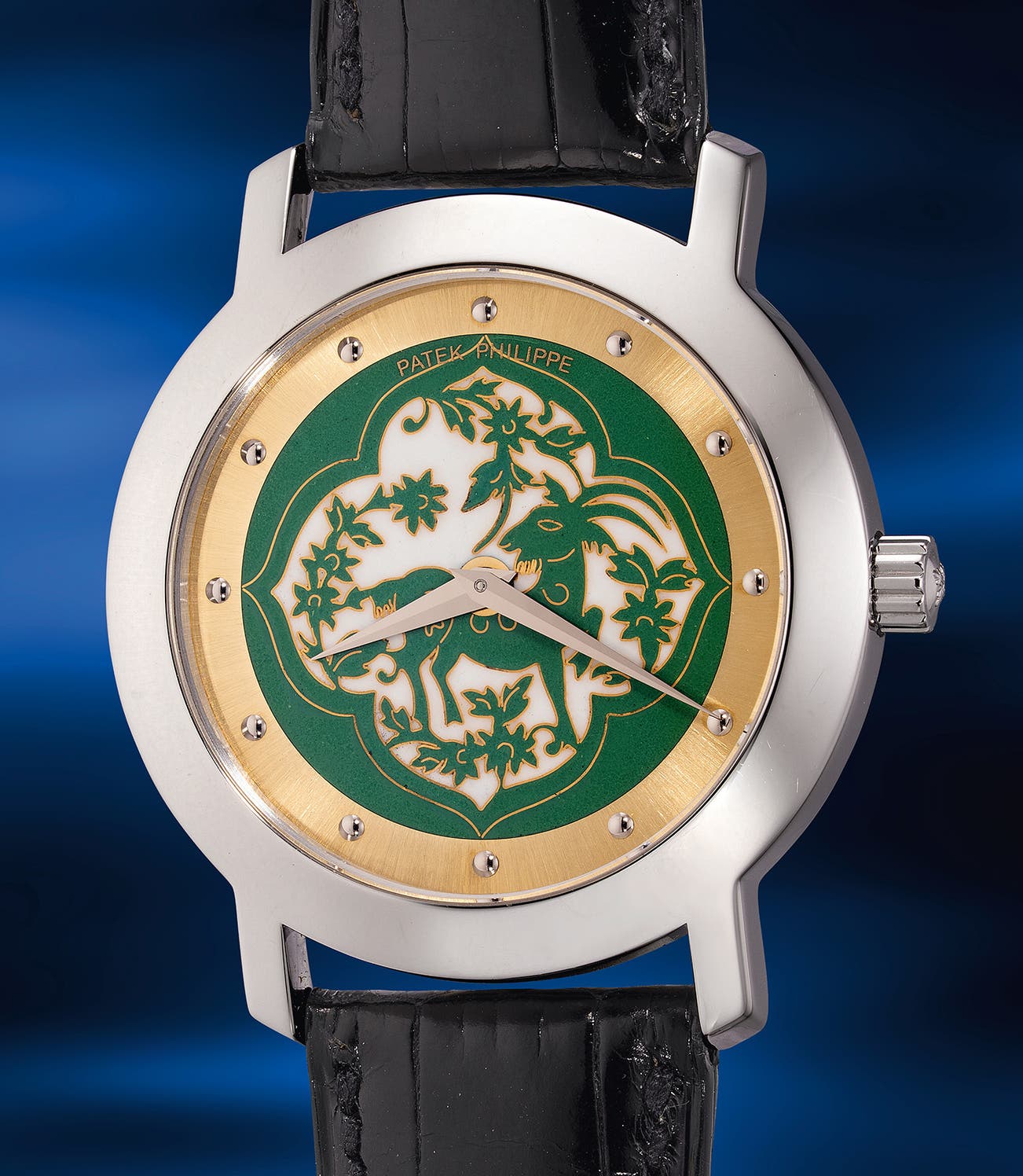 The current dial showcases a green goat motif adorned with green and white enamel, symbolizing gentleness, artistic talent, prosperity, and kindness in Chinese culture. Having remained in the same collection for over 20 years, this example is exceptionally well-preserved and comes with its original Certificate of Origin, leather portfolio with photographs and presentation box.