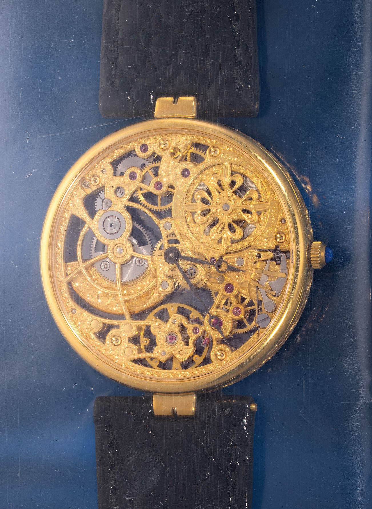 A "new-old-stock" and rare yellow gold skeletonized wristwatch with Certificate of Origin and presentation box – single-factory-sealed