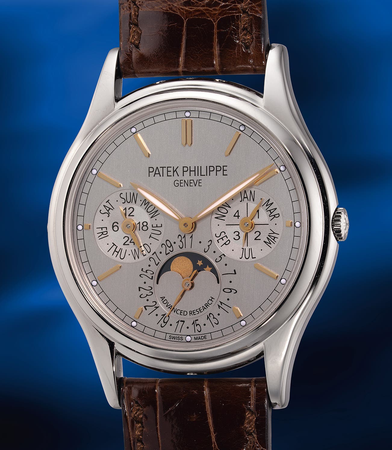 A “like-new”, highly rare and attractive limited edition platinum perpetual calendar wristwatch with moon phases, 24-hour, leap year indication, Silinvar escape wheel, patented Spiromax balance spring and Pulsomax escapement, additional solid caseback, setting pin, Certificate of Origin and presentation box, made in a limited edition of 300 pieces