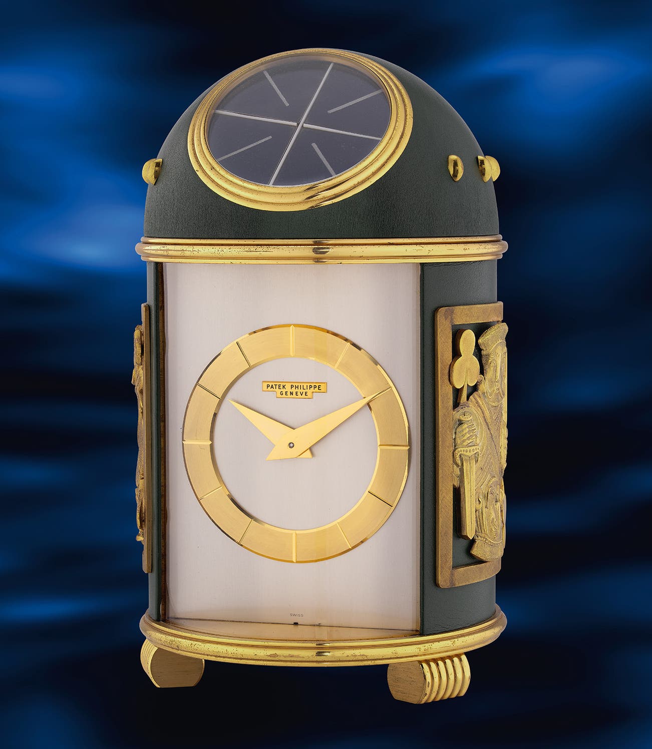The present gilt brass solar-powered dome clock by Patek Philippe is an exceptionally rare and exclusive example from the 1960s. Featuring a Bridge Cards decoration, this dome clock boasts a stunning green leather exterior instead of the usual cloisonné enamel, as confirmed by the Extract from the Archives. The four panels correspond to the four Kings of the suits (hearts, diamonds, spades, and clubs) in bridge cards. Leather clocks are extremely scarce, with only a handful reappearing on the market to date.