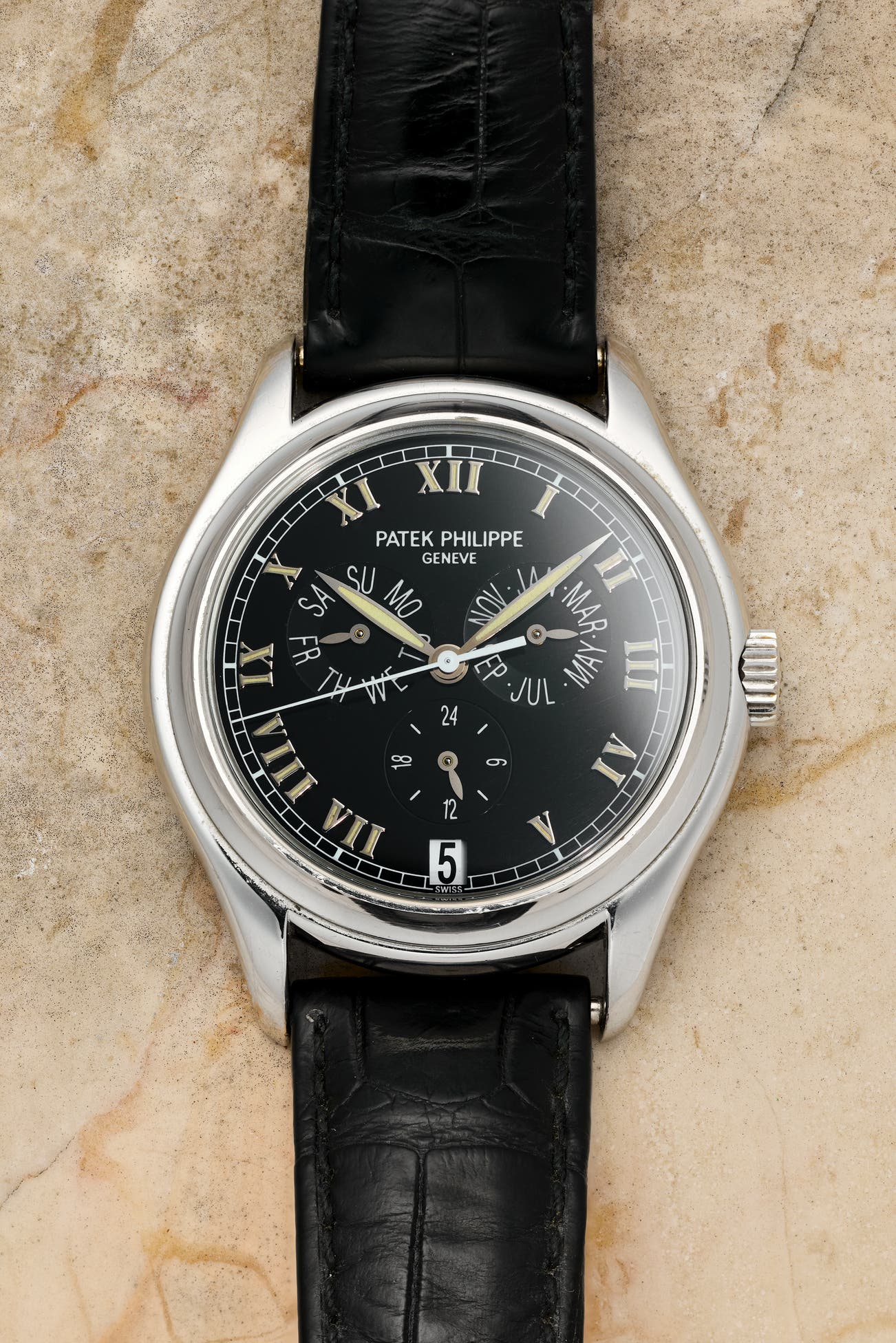 An attractive platinum annual calendar wristwatch with semi-gloss black dial, center seconds, 24-hour indicator, Extract from the Archives, and presentation box