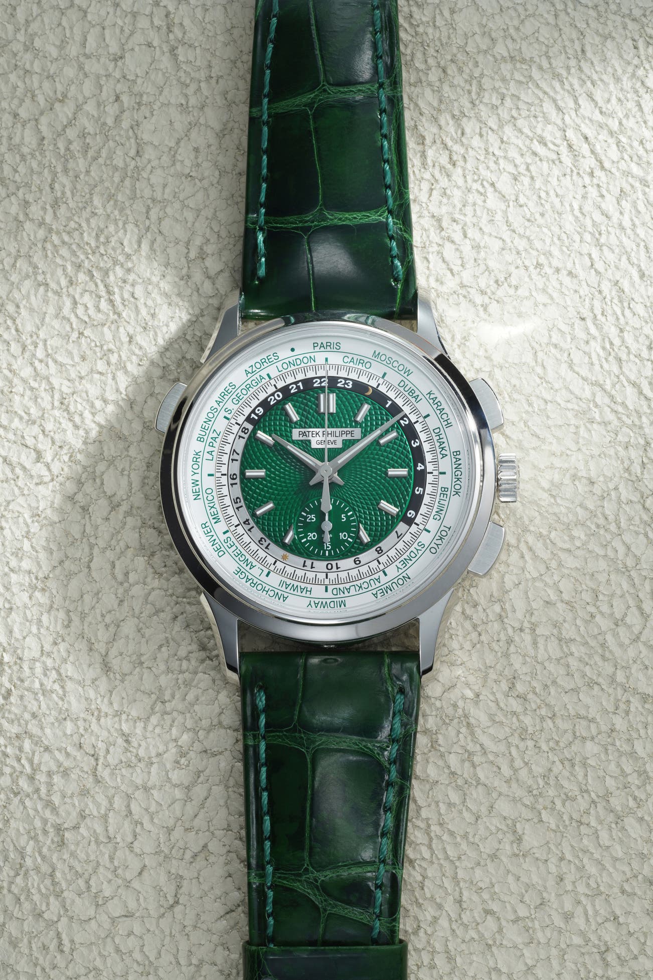 - At the 2019 Watches Art Grand Exhibition held by Patek Philippe in Singapore, the ref. 5930 was selected and made as a limited edition model of 300 pieces only featuring a red hand-guilloche dial with “SINGAPORE” translated via a small red dot on the city ring. Fast forward a year later, after a successful reception of the model since its Singapore limited edition, Patek Philippe released the reference in platinum featuring a vibrant green hand-guilloche dial.
